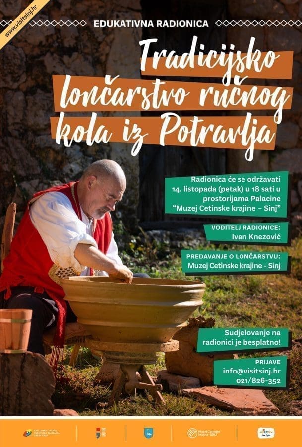 Nakon niza uspješnih i rado posjećenih radionica, Turistička zajednica grada Sinja, pod pokroviteljstvom Ministarstva kulture i medija Republike Hrvatske i u suradnji s Muzejom Cetinske krajine u Sinju i ove godine, organizira edukativnu radionicu ‘Tradicijsko lončarstvo ručnog kola iz Potravlja’.
