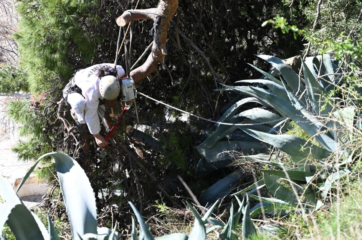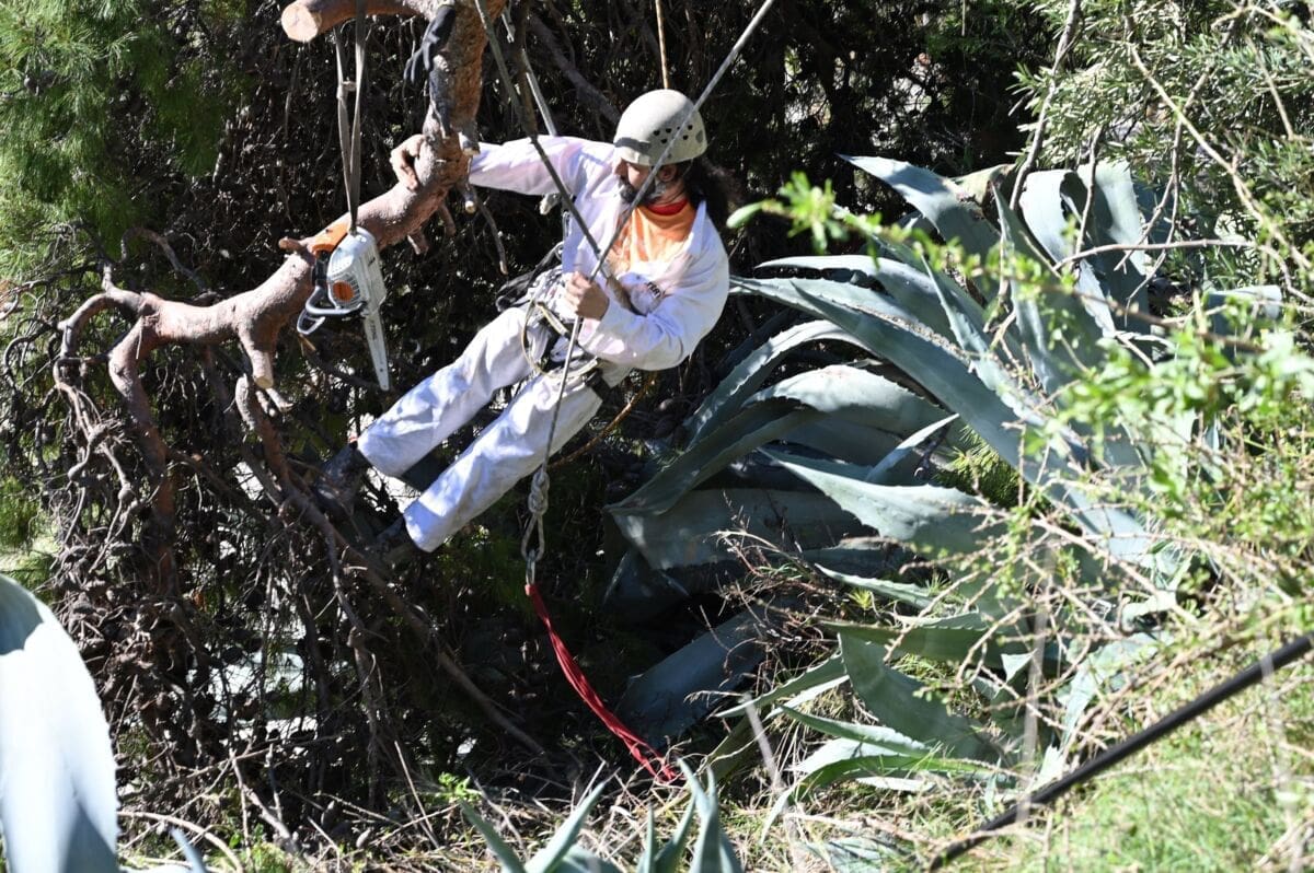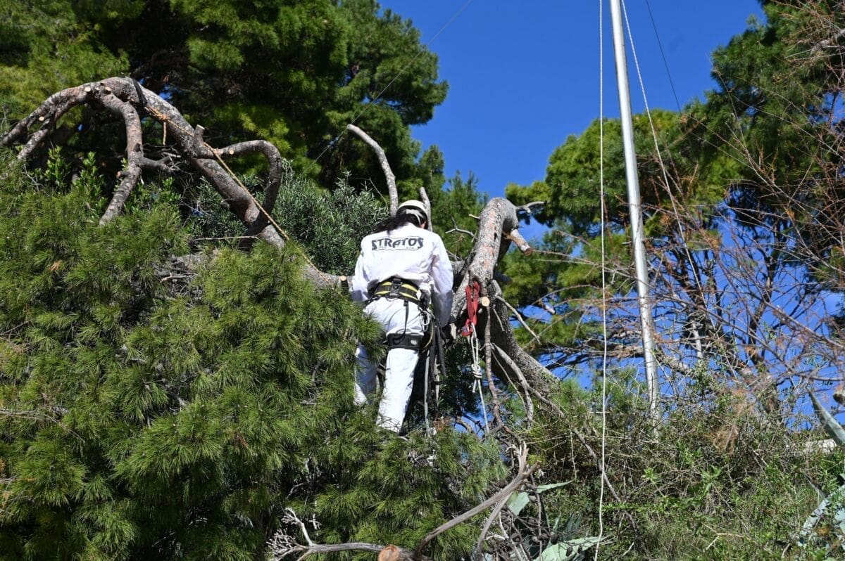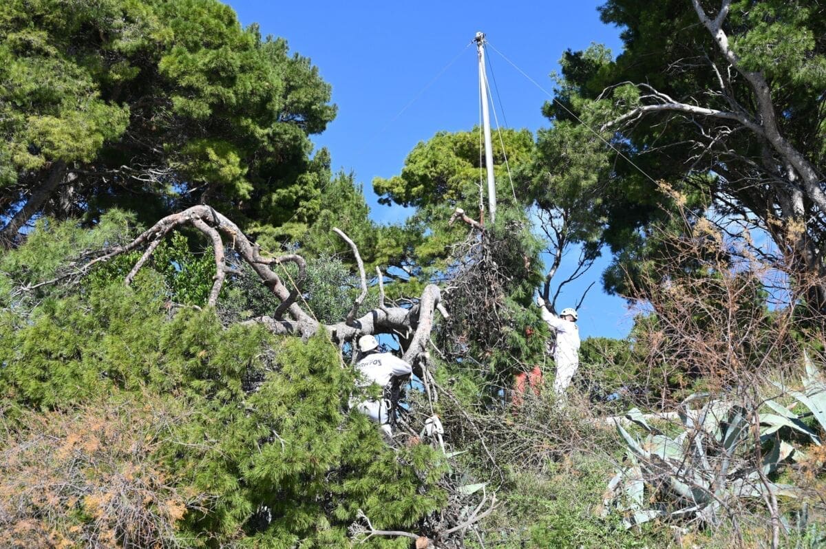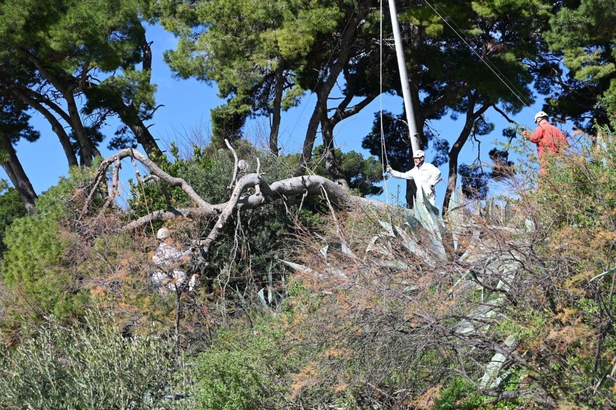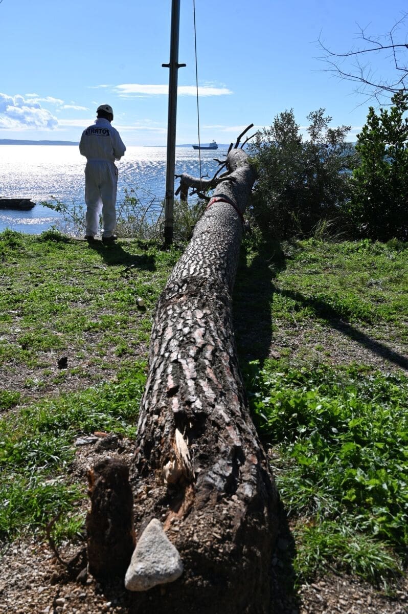 Stablo se prvo opasno nagnulo prema jugu, a onda i palo preko tamošnjeg zidića. Na uklanjanju oborenog bora sudjelovali su djelatnici tvrtke "Stratos d.o.o."