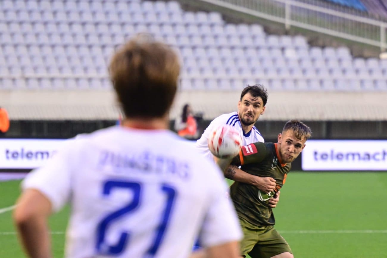 U 32. je minuti Rebić pokušao ubaciti, gosti su odbili u korner iz kojeg je Rebić pucao glavom u drugu stranu. Sedam je minuta kasnije Pukštas pucao glavom nakon Rebićeva ubačaja, Malenica je bio siguran. U 40. je minuti Mejía faulirao Pukštasa na sredini terena. Do kraja poluvremena nije bilo većih prilika, a publika je zazviždala jasno izražavajući mišljenje o poluvremenu.