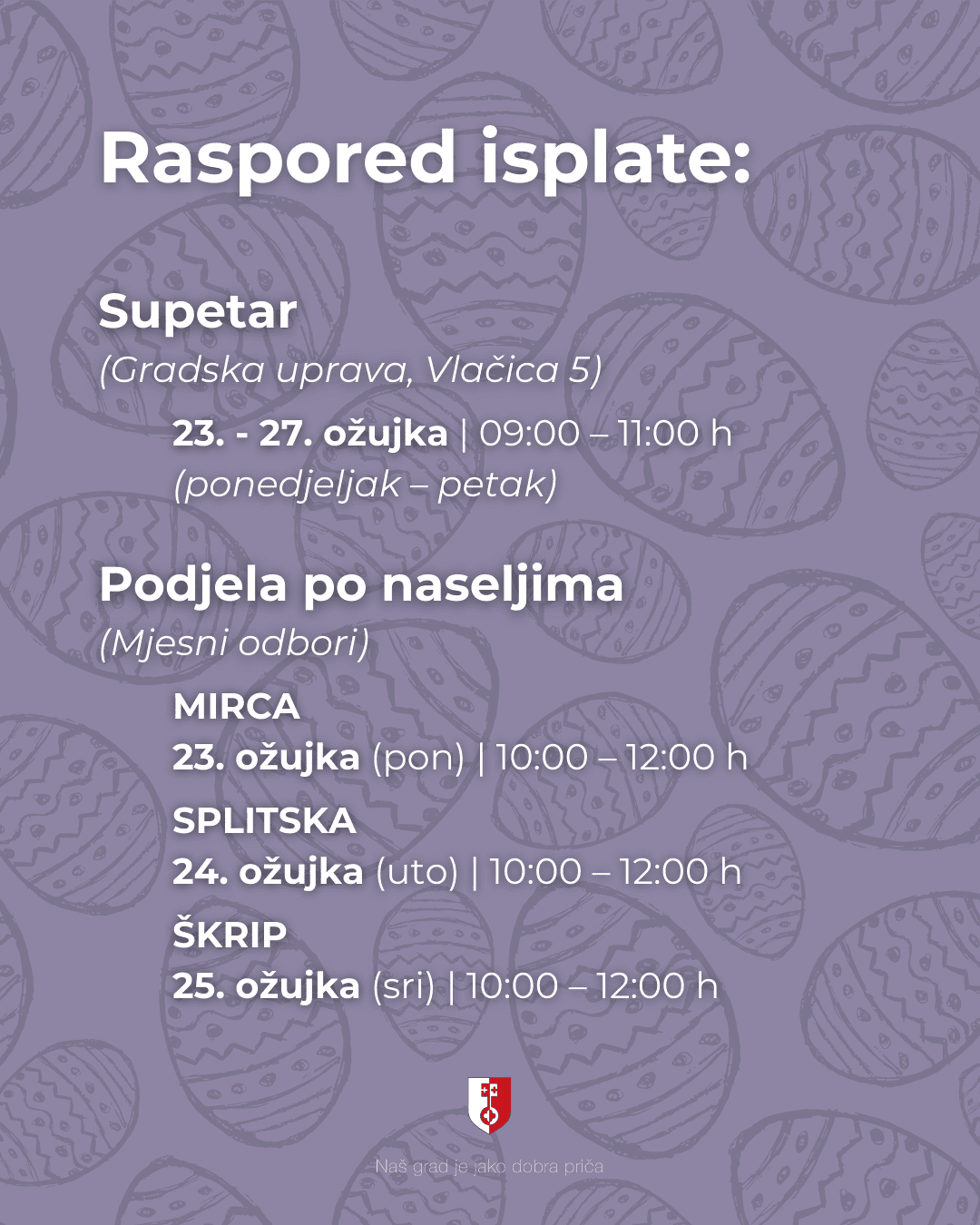 Kako bi se omogućila što dostupnija isplata, uskrsnice će se dijeliti i po naseljima prema sljedećem rasporedu: u Mircima 23. ožujka, u Splitskoj 24. ožujka te u Škripu 25. ožujka 2026. godine, u vremenu od 10:00 do 12:00 sati u prostorijama mjesnih odbora.