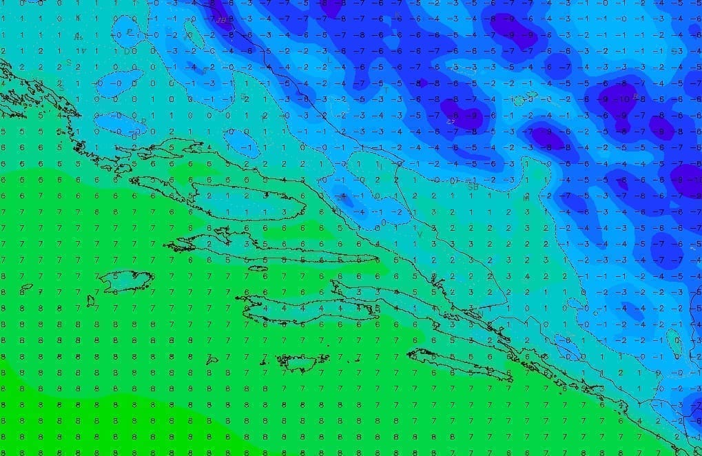 Danas nas očekuje djelomično sunčan i u većini predjela suh dan. Na jugu Dalmacije, podno Biokova i Dinare, i na Braču povremeno može biti slabe kiše i snijega u drugom dijelu dana. U Konavlima u noći na utorak može pasti i nekoliko centimetara snijega. Puhat će umjerena do jaka bura, i dalje će mjestimice imati olujne udare. Minimalne jutarnje temperature zraka od 2 do 8°C, najviše dnevne većinom od 5 do 11°C.