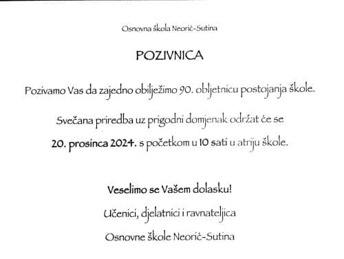 Osnovna škola Neorić - Sutina sutra će svečanom priredbom obilježiti 90-u obljetnicu od početka rada. Sve do 1934. godine ova dva sela, Neorić i Sutina, nisu imali školsku zgradu niti se nastava odnosno organizirani pedagoški rad odvijao za njihovu djecu. Samo ih je nekoliko odlazilo u školu u Gornji Muć. Krenulo je sa Zborom seljaka 1923. kojeg je sazvao predstavnik sela, glavar, Veić Ante pok. Marka. Na njemu je donesena odluka o izgradnji škole.
