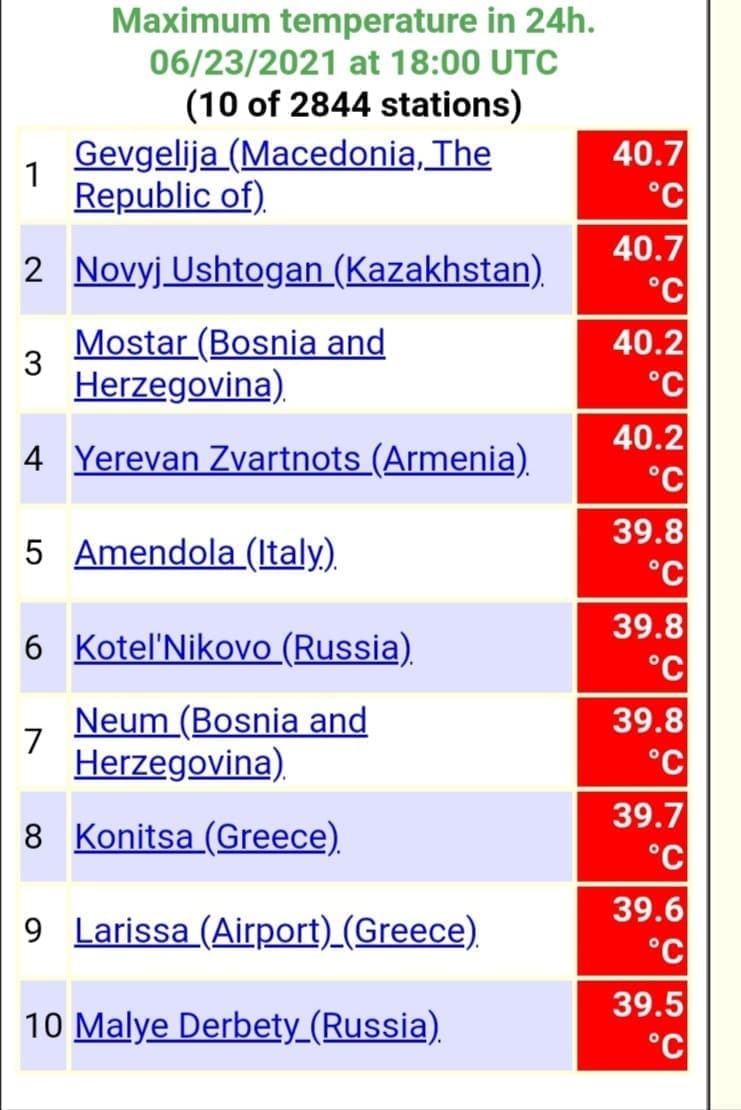 Jugoistočna Europa je danas bila najtopliji dio Europe. Mostar je izmjerio za lipanj rekordnih 40.2°C, a Đevđelija u Makedoniji 40.7°C.