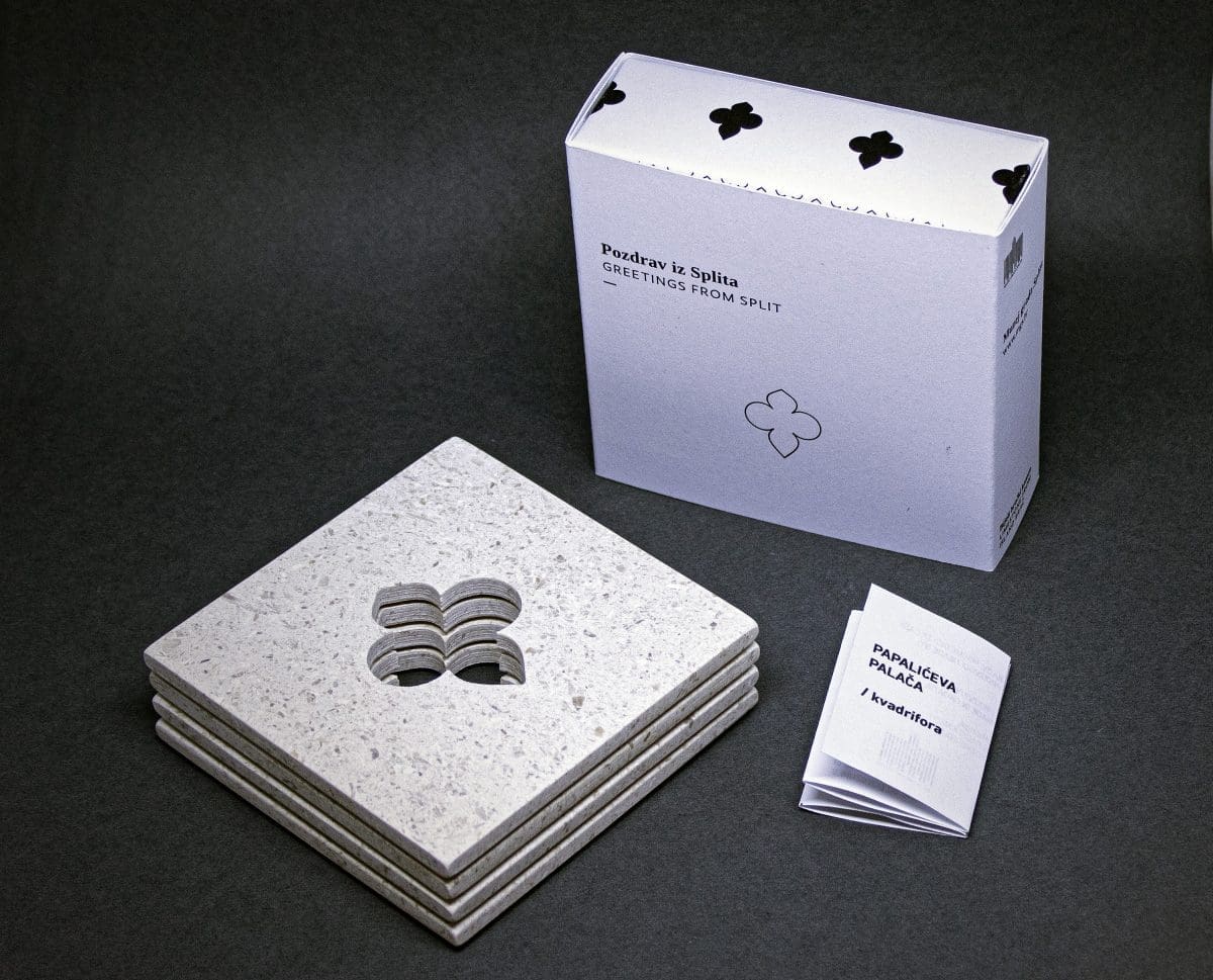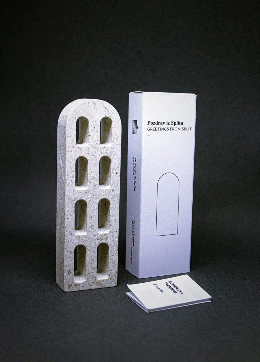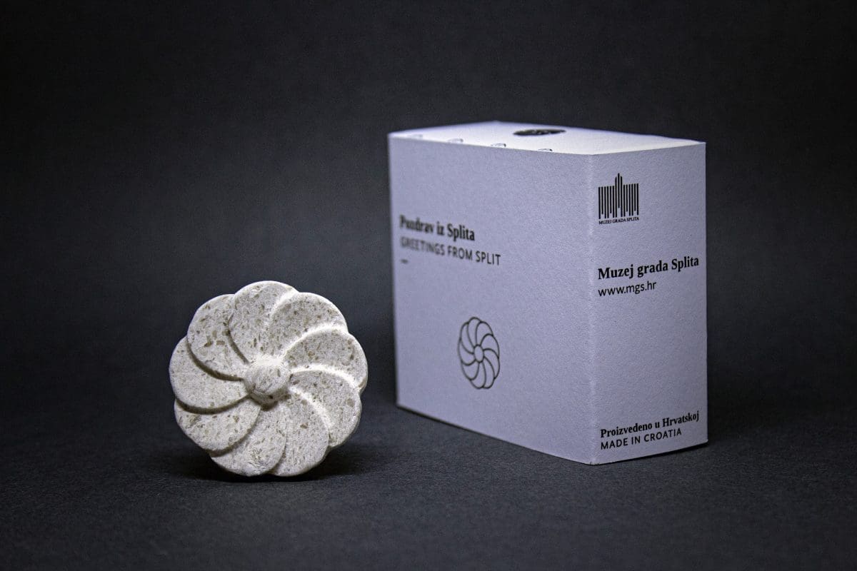 "Za ovakav projekt bilo je jako važno osmisliti proizvode koje mogu proizvesti lokalni umjetnici / obrtnici. Odlučili smo se i za materijal koji se nalazi neposredno blizu lokacije, a to je brački kamen. Odabrali smo brački kamen zbog toga što je Dioklecijanova palača građena od istog, ekološki je prihvatljiv i lokalni obrtnici ga obrađuju. S time smo dobili i autentičnost projekta jer su rijetki suveniri od bračkog kamena na cjelokupnom tržištu", pojasnila je Dina Jakšić iz Galerije Jakšić ideju za nastanak ovih suvenira.
