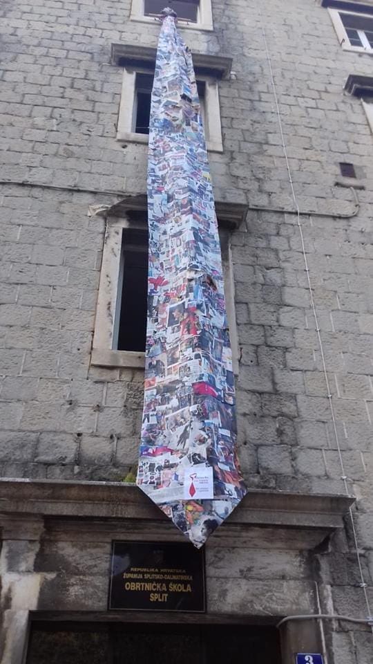 Svjetski dan kravate obilježila je i Obrtnička škola Split. Kako su nam dojavili učenici, mladi modni tehničari ove škole tjednima su izrađivali golemu kravatu od novinskog papra, a izvjesili su je na prozor svoje škole gdje se i danas može vidjeti.