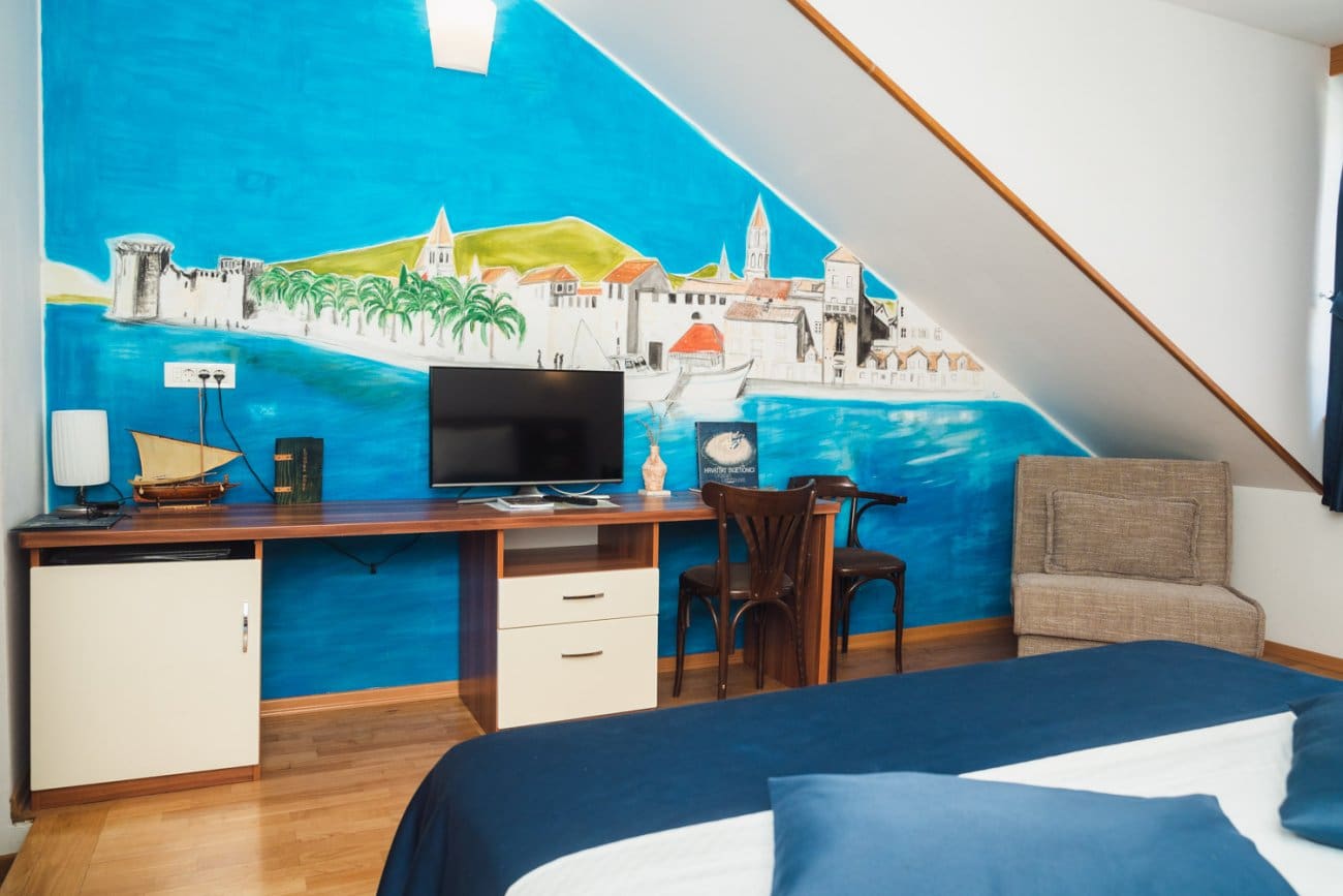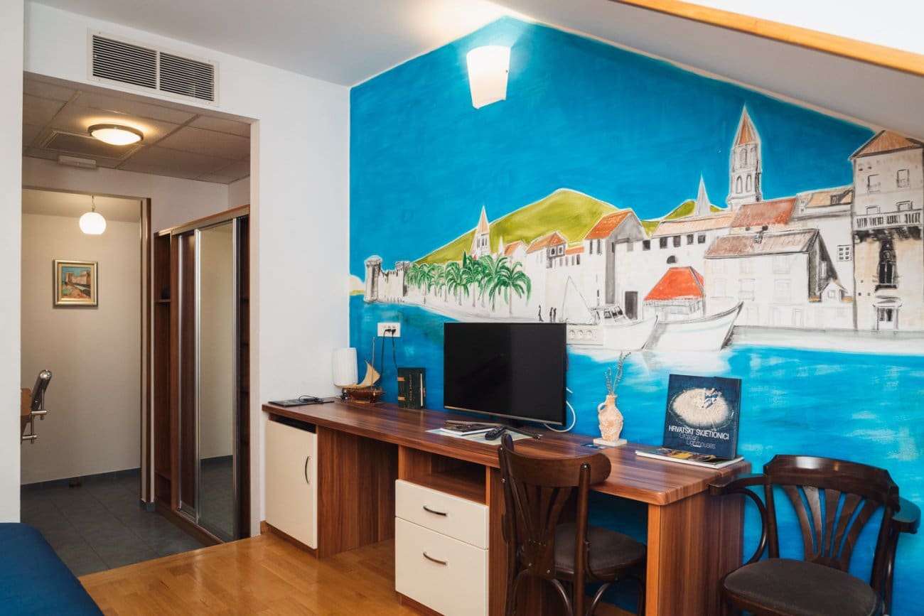 Osim što dio Splićana gotovo, pa ne zna za konobu More sigurno ima i onih koji isto tako ne znaju da se iznad nje nalazi šest soba koje nose po četiri zvjezdice. Svaka od njih sa svojim imenom. Kako i priliči u stvarnom okruženju prva je Split, a zatim Vranjic, Solin, Klis, Kaštela i Trogir. Zahvaljujući kćeri umjetnici, Nataši Pavlov, u svakoj sobi je na zidu oslikana panorama tog grada ili mjesta.