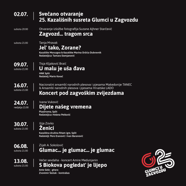 Svečano otvaranje 25. kazališnih susreta Glumci u Zagvozdu zakazano je za subotu 2. srpnja, a ovogodišnje izdanje posvećeno je glumcu Žarku Potočnjaku.