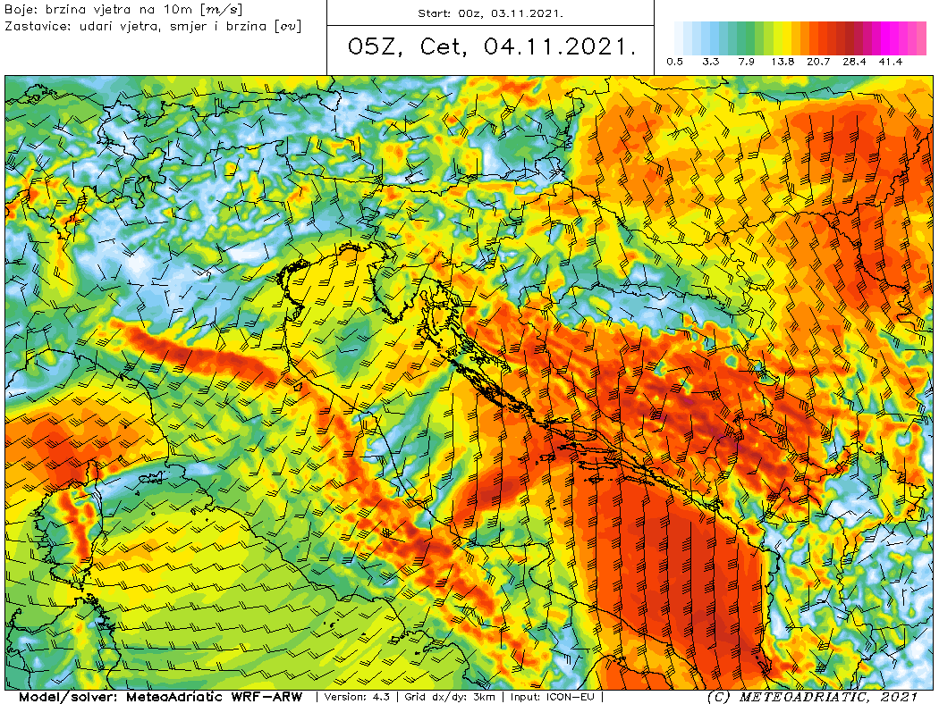 Prema podacima DHMZ-a najjači udar vjetra izmjeren je na Svetom Juri na Biokovu i iznosio je 115,2 km/h. Slijede Komarna 94 km/h, Lastovo 82 km/h, Hvar 77 km/h, Split Marjan 68 km/h.
