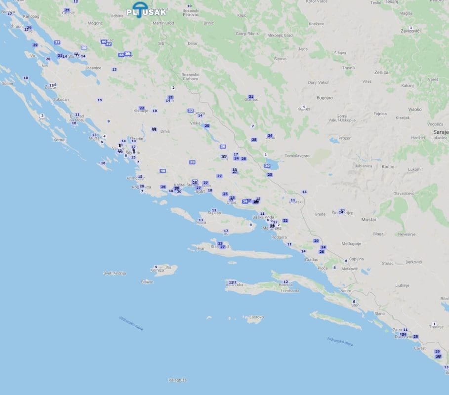 Do 19 sati, prema podacima mreže postaja Pljusak.com, najviše kiše je palo u Kučićima kod Omiša, 60 litara po kvadratnom metru. Na splitskom području je palo 20 do 30 litara kiše, no posvuda se glavnina oborina očekuje u noći na četvrtak i tijekom četvrtka.