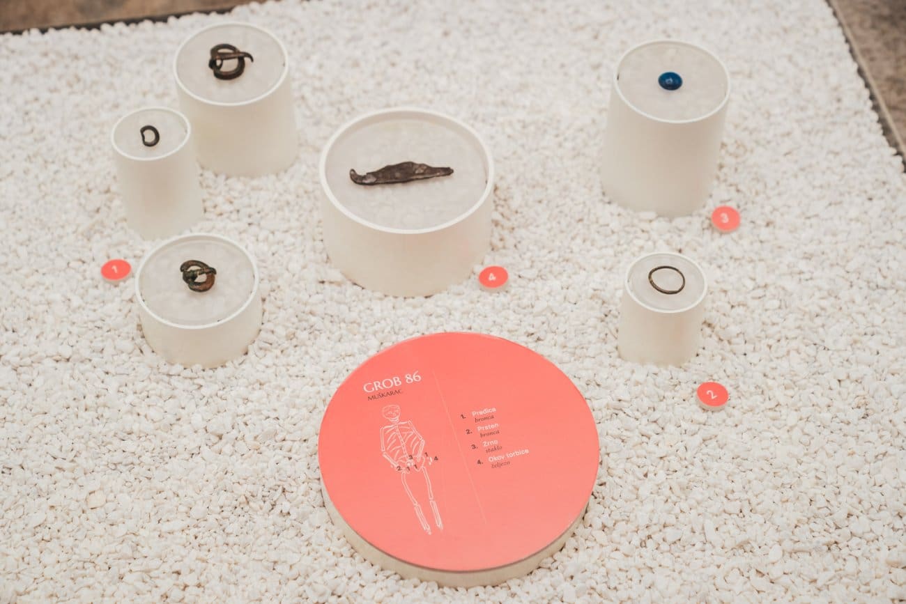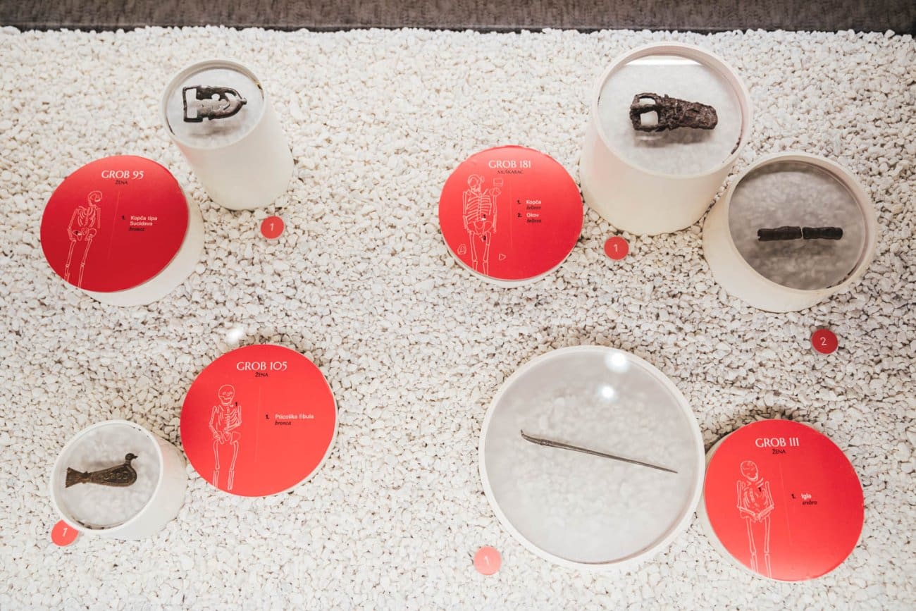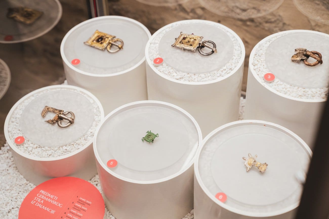 Posjetitelji mogu vidjeti brojne predmete iz svakodnevnog života i pogrebnih običaja – od dijelova nošnje poput pojasnih kopči, fibula i igala do nakita kao što su ogrlice, narukvice i naušnice. Posebnu pažnju privlače pozlaćene pojasne kopče germanskog, odnosno ostrogotskog stila, ukrašene poludragim kamenjem, koje spadaju među najluksuznije kasnoantičke nalaze u Dalmaciji.