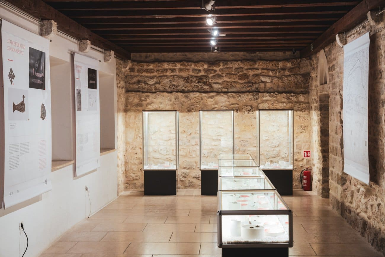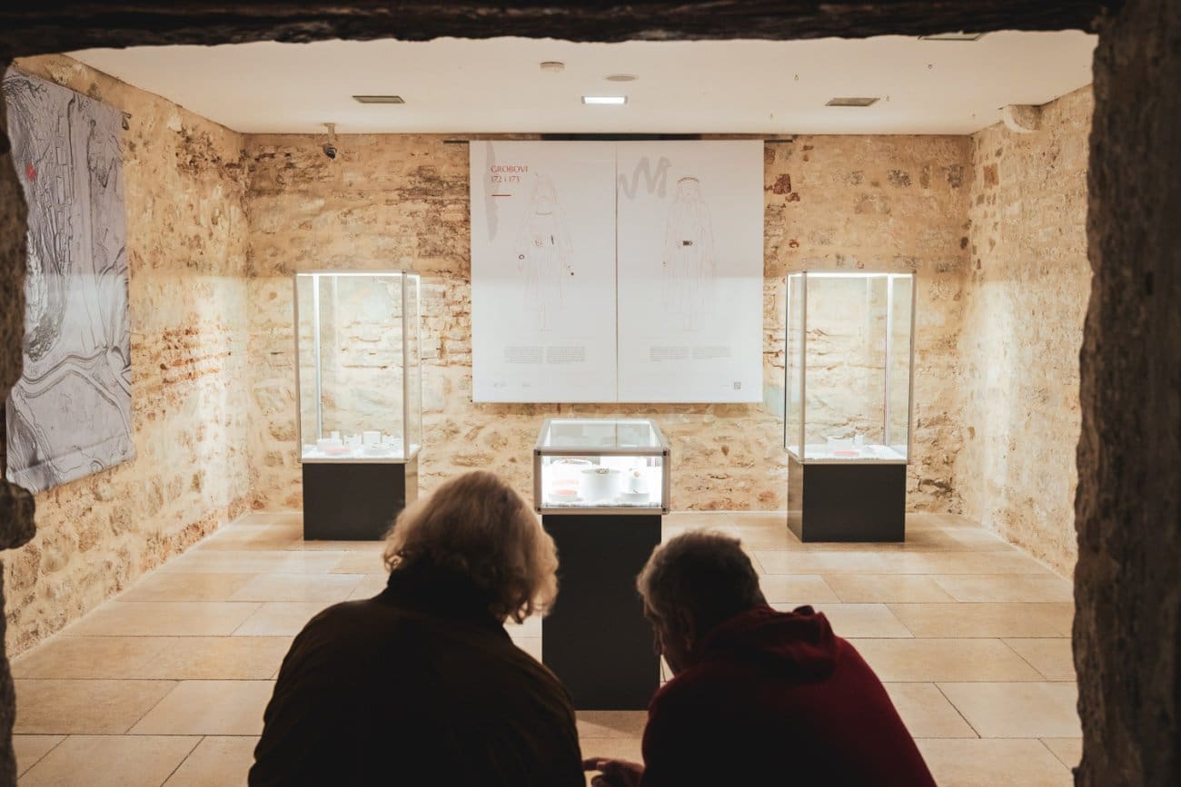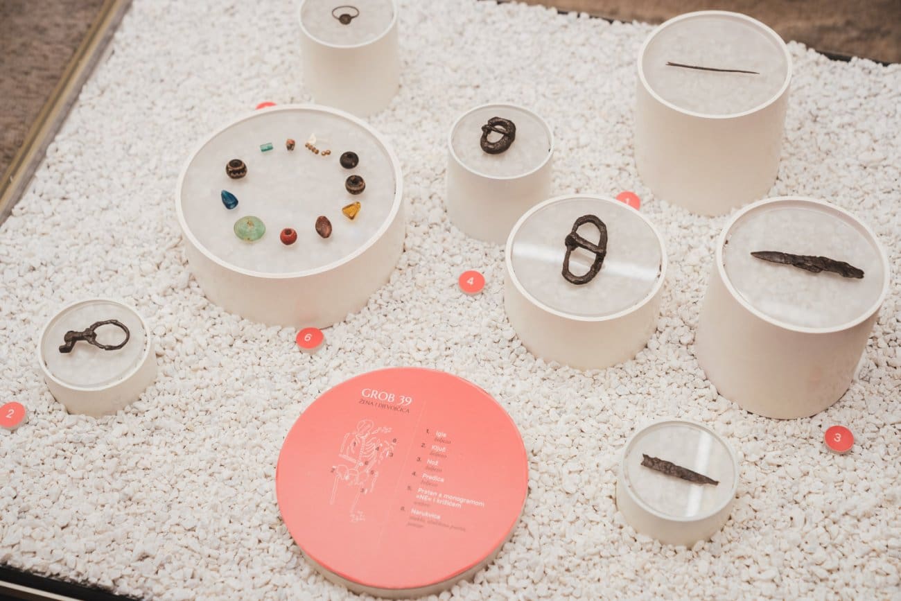 Posjetitelji mogu vidjeti brojne predmete iz svakodnevnog života i pogrebnih običaja – od dijelova nošnje poput pojasnih kopči, fibula i igala do nakita kao što su ogrlice, narukvice i naušnice. Posebnu pažnju privlače pozlaćene pojasne kopče germanskog, odnosno ostrogotskog stila, ukrašene poludragim kamenjem, koje spadaju među najluksuznije kasnoantičke nalaze u Dalmaciji.