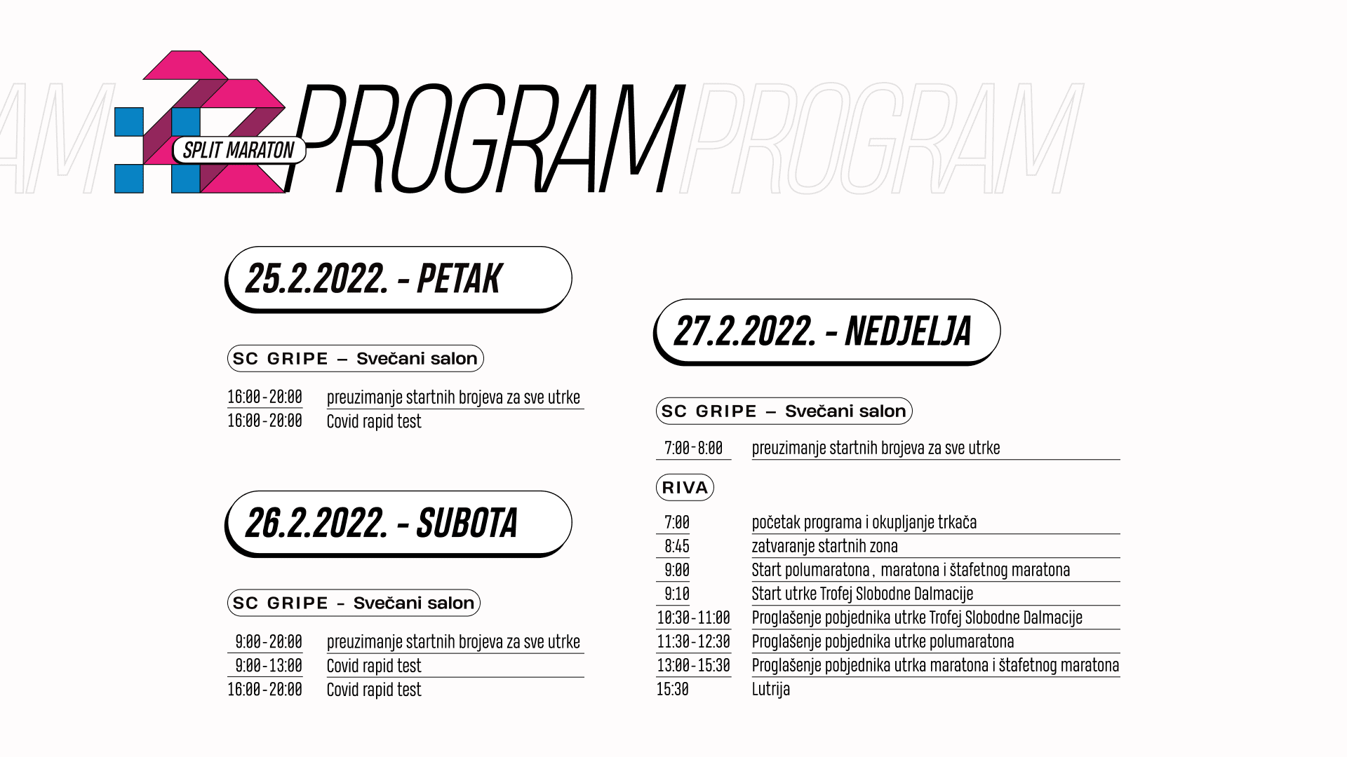 Radi se o najvećem multidisciplinarnom događaju u Splitu, na čijoj se organizaciji radi 365 dana u godini. Sve je već spremno za start te ostaje samo završno uređenje i standardno ishođenje dozvola, koje se po proceduri izdaju 14 dana prije događaja. Vrijedi naglasiti da je maraton u skladu sa standardima velikih svjetskih utrka, koji podrazumijevaju provedbu strogog covid protokola. Ovaj veleban i bitan događaj za grad Split će se odviti 27. veljače.