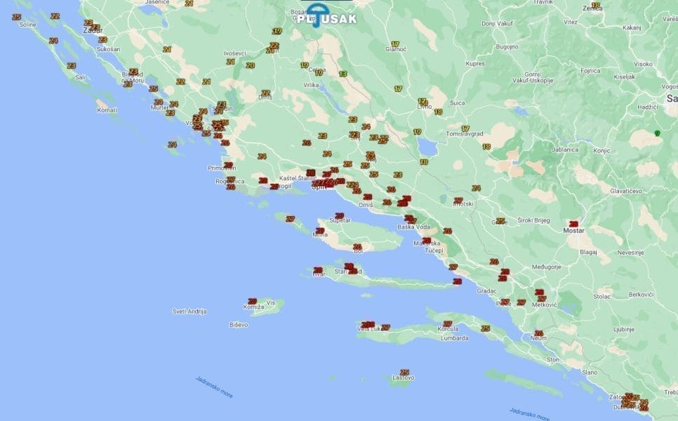 Uoči dolaska fronte u Dalmaciji se temperature zraka kreću od 19 do 26 u Zagori i čak do 30°C ponegdje na obali i otocima.