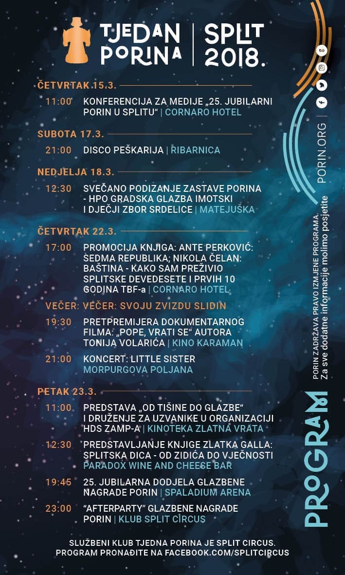 Najmlađi članovi Dječjeg zbora Srdelice uz podršku HPO-a Gradske glazbe Imotski u 12.30 sati podignuli su zastavu koju je ispratio i gradonačelnik Andro Krstulović Opara te je ovim činom i službeno započeo Tjedan Porina. Organizatori su i ove godine pripremili mnogobrojna popratna događanja, koja će biti izvrsna uvertira u završnu dodjelu glazbene nagrade koja će se održati 23. ožujka u Spaladium Areni. Svi događaji su besplatni za sve posjetitelje.