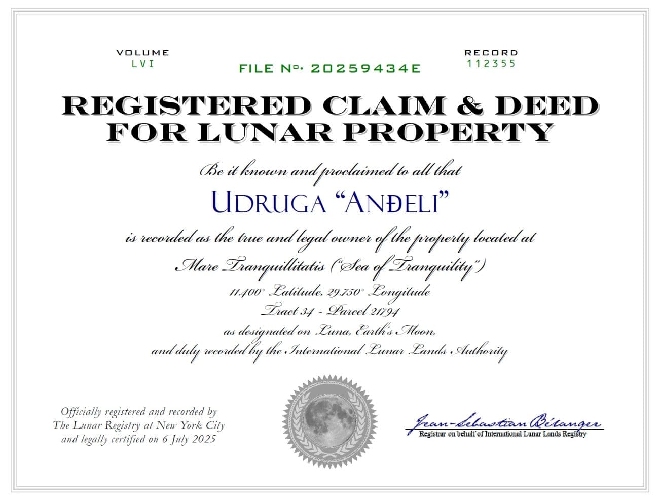 Prema službenim dokumentima, Udruga “Anđeli” postala je zakoniti vlasnik zemljišta u poznatom mjesečevom bazenu Mare Tranquillitatis – “Morje tišine” – na koordinatama 11.400° sjeverne geografske širine i 29.750° istočne geografske dužine. Registracija je službeno provedena 6. srpnja 2025. godine putem International Lunar Lands Authority, s potvrdom izdanom od strane Lunar Registryja u New Yorku.