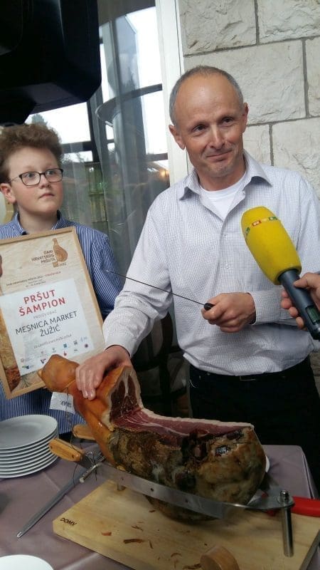 Vjekoslav Žužić i njegova mesnica s otoka Krka ove godine ima najbolji pršut i to mu je druga šampionska titula na Danima hrvatskog pršuta. Cijena njegovog ručno rezanog pršuta u trgovinama se, kako nam je rekao, prodaje za 400 kuna kilogram, a po ugostiteljskim objektima za oko 1.000 kuna kilogram.