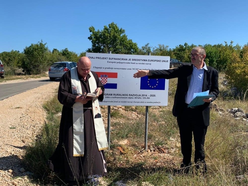 Fra Jakov Begonja i fra Jozo Jukić uz molitvu, blagoslovili su Društveni dom i cestu Unešić – Vinovo Donje.