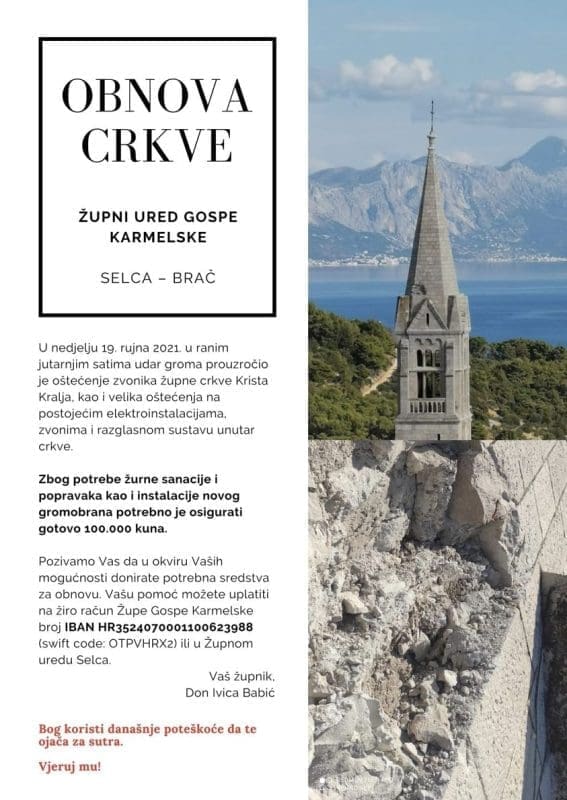 "Pozivamo Vas da u okviru Vaših mogućnosti donirate potrebna sredstva za obnovu. Vašu pomoć možete uplatiti na žiro račun Župe Gospe Karmelske broj IBAN HR3524070001100623988 ili u župnom uredu Selca", stoji u župnikovoj objavi.