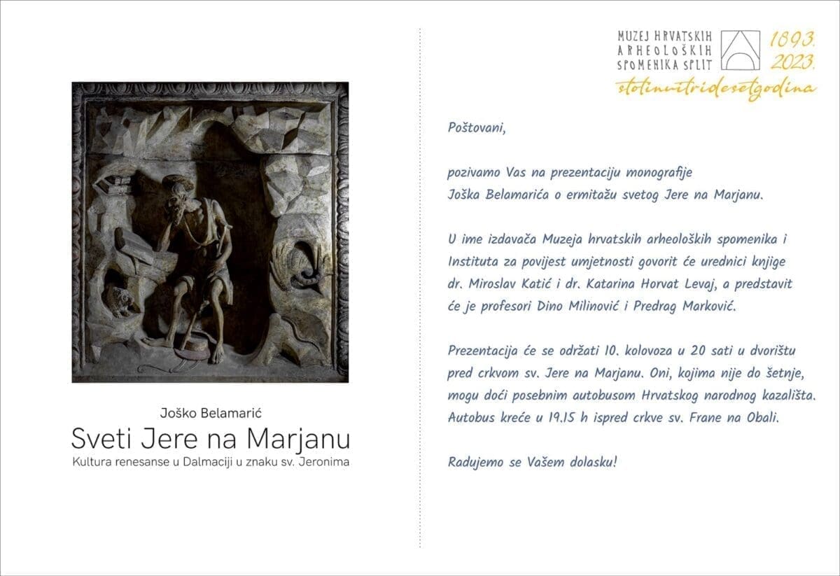 Prezentacija monografije Joška Belamarića o ermitažu svetog Jere na Marjanu održat će se 10.kolovoza u 20 sati u dvorištu pred crkvom sv. Jere.