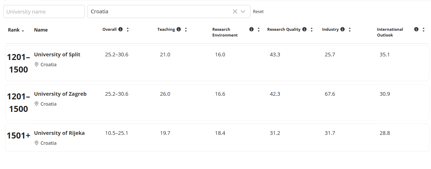 Najbolje rangirana hrvatska sveučilišta, Zagreb i Split, našla su se u rasponu od 1201. do 1500. mjesta, s ukupnim bodovima između 25,2 i 30,6. Sveučilište u Zagrebu izdvojilo se po industrijskoj suradnji (67,6), dok je Split nešto bolje ocijenjen u području istraživačke kvalitete (43,3). Rijeka je svrstana još niže, u kategoriju 1501+, s najslabijim ukupnim učinkom među hrvatskim institucijama.
