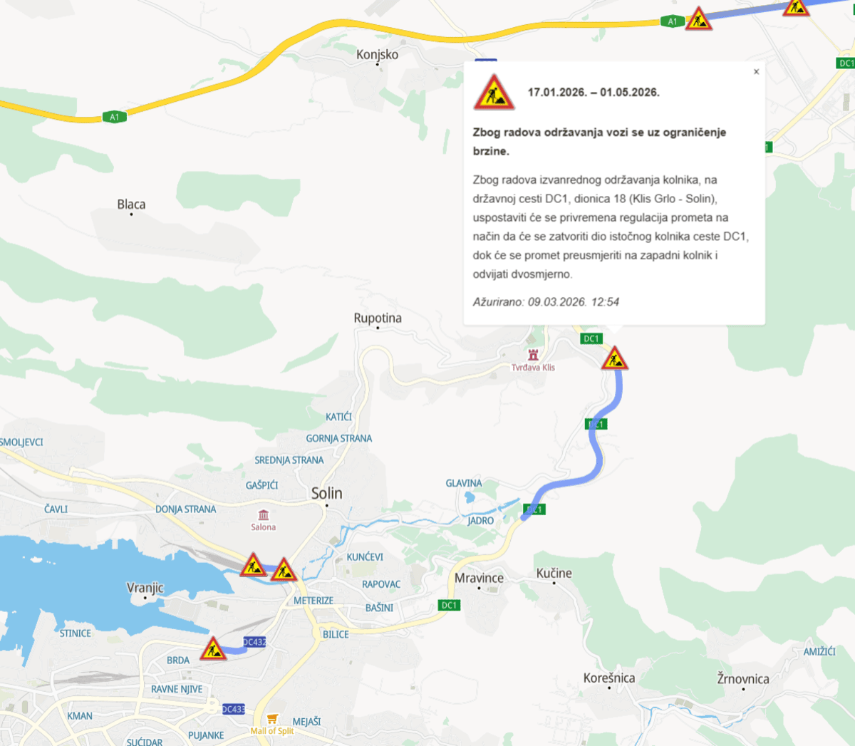 Svi već s nestrpljenjem očekuju kraj radova na državnoj cesti DC1, točnije na brzoj cesti Solin-Klis, gdje su svakodnevne gužve i usporen promet postali dio rutine vozača.