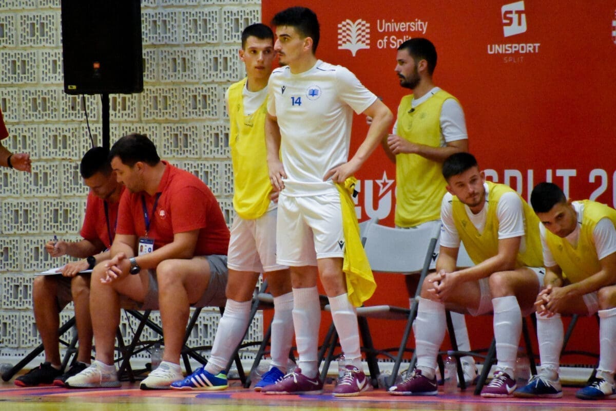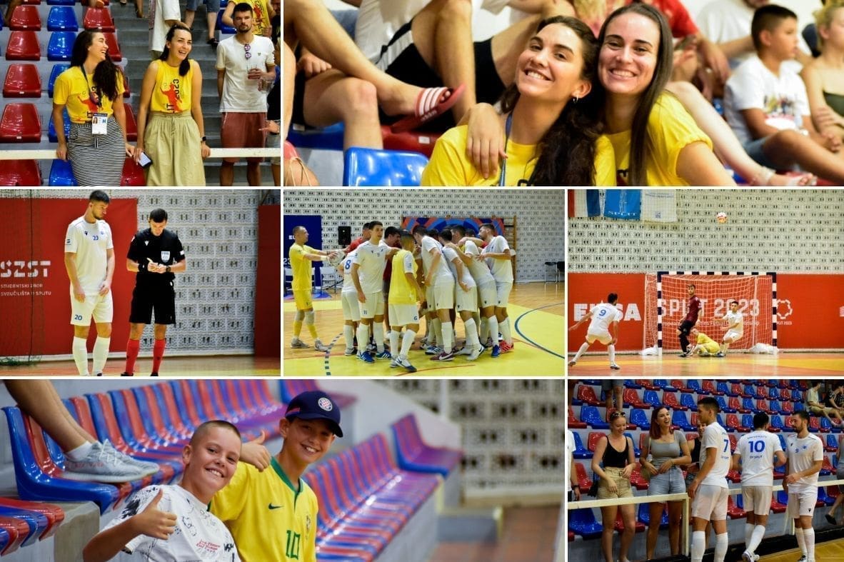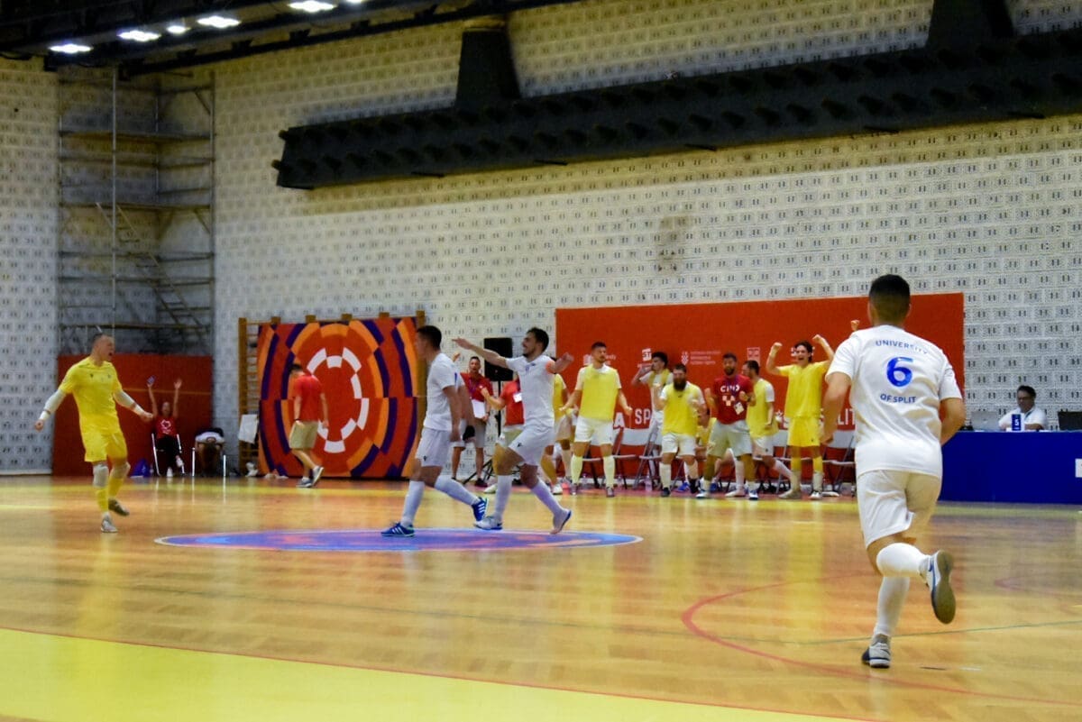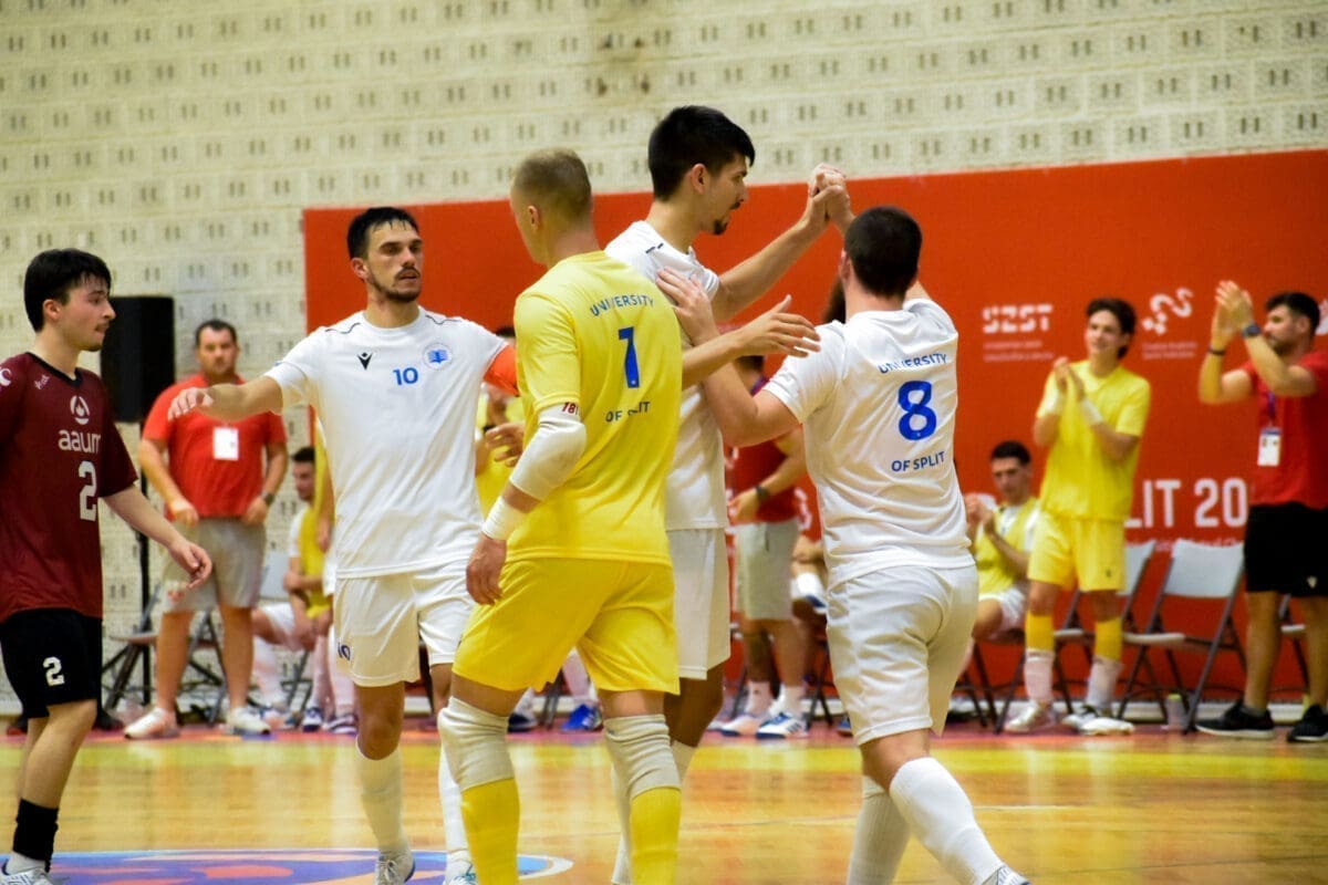Prva je utakmica splitskih studenata u konkurenciji muškaraca odigrana u četvrtak predvođena sjajnom atmosferom na Gripama, a Splićani su slavili protiv Finaca, 5:0. Dva je gola zabio Ante Crnac, po jedan su dodali Luka Grubišić i Ivan Leko, a loptu je u pogrešan gol poslao Mauri Anselmi Niukko. U drugoj su utakmici slavili s visokih 8:2, a strijelci su bili Marko Gašpar i Domagoj Čule s dva pogotka te Luka Grubišić, Ante Crnjac, Josip Čikojević i Karlo Kovačić s jednom golom. Treća je utakmica bila još uspješnija kao i prethodne dvije, s visokih 9:0 poraženo je mađarko Sveučilište iz Pecsa. Mrežu su tresli Duje Vladović i Ante Crnjac po dva puta, a jednom Luka Grubišić, Marko Gašpar, Duje Kustura, Josip Čikojević i Karlo Kovačić.