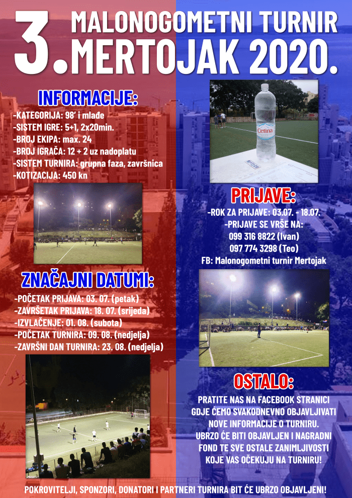 Počele su prijave za malonogometni turnir na Mertojaku koji je organiziran za kategoriju ’98. godište i mlađe, odnosno sve igrače do 22 godine. Ovaj turnir pravo je osvježenje za splitski, ali i dalmatinski mali nogomet te su mlađi igrači ovaj dugoočekivani turnir napokon dočekali. Za ‘Malonogometni turnir Mertojak’ ovo je treće izdanje, a s obzirom na to da su prošle godine premašena sva očekivanja, kako organizacijski, tako i natjecateljski, ovogodišnje izdanje turnira je uzdignuto na još višu razinu. Ove godine očekuje vas mnogo bolji, veći i jači turnir, puno veće nagrade, ali i ono najvažnije - puno bolja fešta na završnom danu turnira!