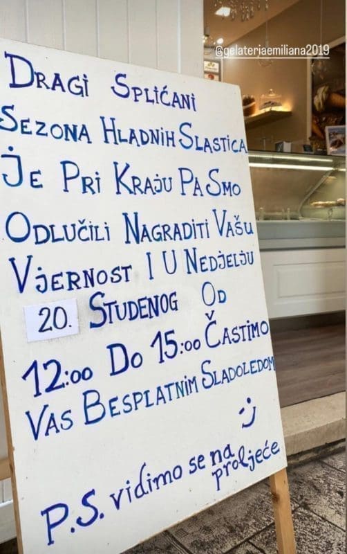 "Dragi Splićani, sezona hladnih slastica je pri kraju pa smo odlučili nagraditi vašu vjernost i u nedjelju 20. studenog od 12:00 do 15:00 častimo vas besplatnim sladoledom. P.S. vidimo se na proljeće", napisali su na tabli ispred sladoledarnice.