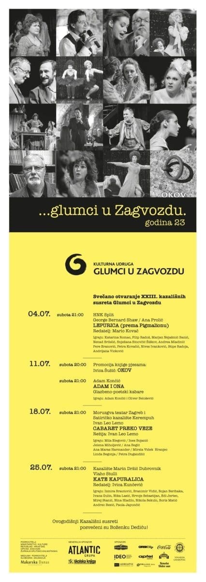 - Sutra nam slijedi promocija knjige Ivice Šošića, našeg Zagvožđanina, profesora književnosti koji piše pjesme o našem kraju. Ovdje se radi o zbirci pjesama koja se zove Okov. Tu su pjesme o Biokovu, zavičaju i njegovom djetinjstvu. Nakon toga je kabare Adam, autora Adama Končića. Tu će se kroz pjevanje i recitacija poezije napraviti jedna lijepa glazbena večer, sa starim evergreenima ljubavne poezije. 18. srpnja nam dolazi kazalište Kerempuh i teatar Moruzgva s predstavom "Cabaret preko veze". To je jedna zanimljiva predstava u kojoj igraju Ana Maras, Mila Elegović, Darija Lorenzi i Linda Begonja. Na kraju je završetak 25. srpnja s hit predstavom kazališta Marin Držić iz Dubrovnika "Kate Kapuralica", u kojoj igra Branimir Vidić Klika, Izmira Brautović i ansambl dubrovačkog kazališta, govori nam Mlikota.