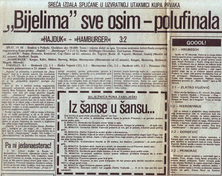 Nakon što su bijeli u hladnom Hamburgu, pred tribinama ispunjenim našim "gastarbajterima", pokazali ne samo da se mogu nositi s tada najjačom europskom momčadi, već da smo poraženi grubom sudačkom greškom nakon preočitog prekršaja nad našim golmanom Pudarom, Split i cijela Dalmacija živjeli su za uzvrat. Zlatko Vujović imao je četiri šanse, od toga dvije stopostotne, uz udarce Šurjaka i Krstičevića.