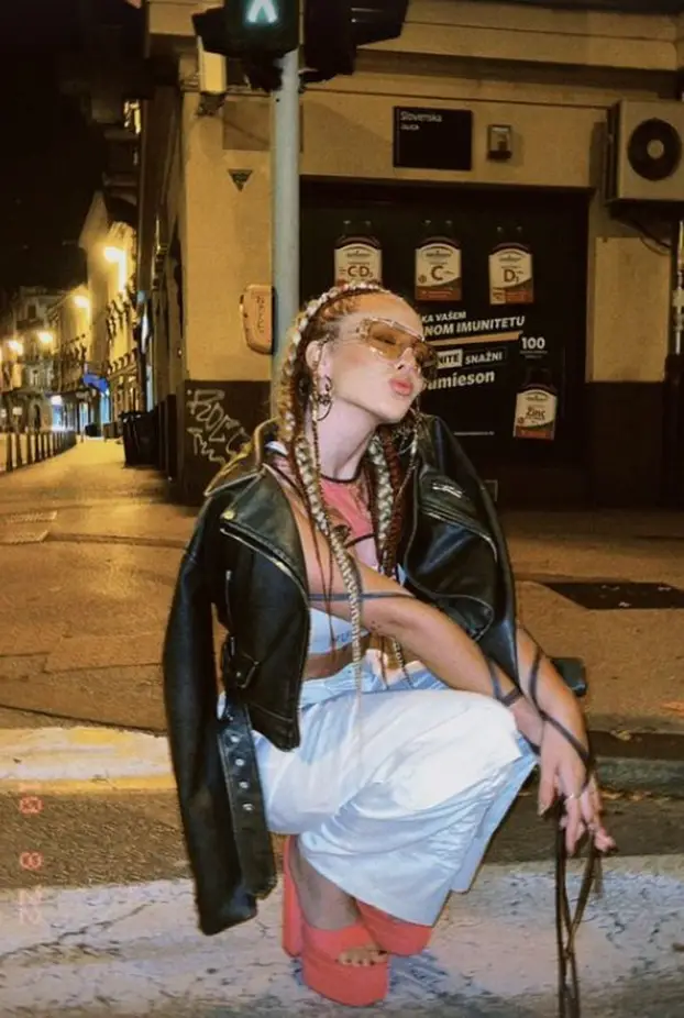 Novu frizuru nazvala je svojim alter egom, a uskladila ju je s kombinacijom. Odjenula je bijele hlače te sportski grudnjak iste boje, a sve je začinila ružičastim štiklama na platformu te crnom kožnom jaknom.