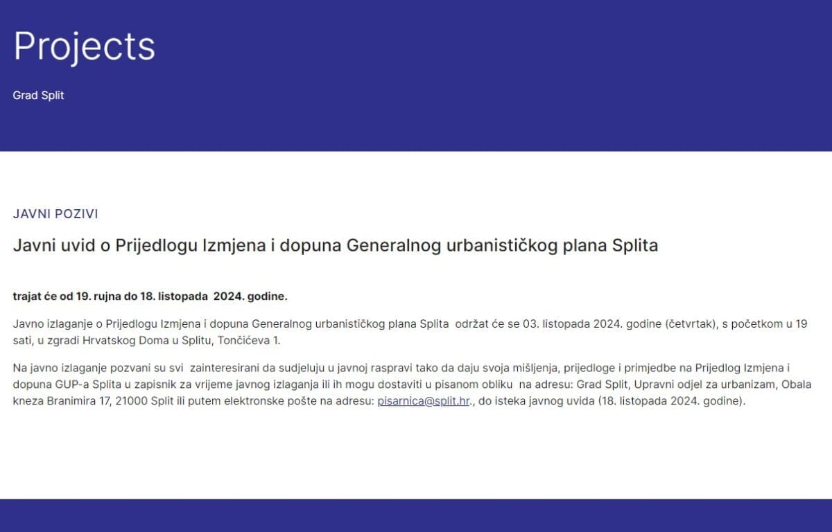 Građanska inicijativa Split objavila je važnu informaciju vezanu za javno izlaganje o prijedlogu izmjena i dopuna Generalnog urbanističkog plana Splita (GUP). Izlaganje će se održati danas, 3. listopada 2024. godine, s početkom u 19 sati u zgradi Hrvatskog doma u Splitu, na adresi Tončićeva 1.