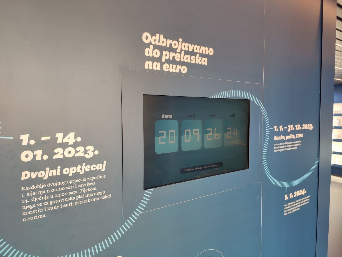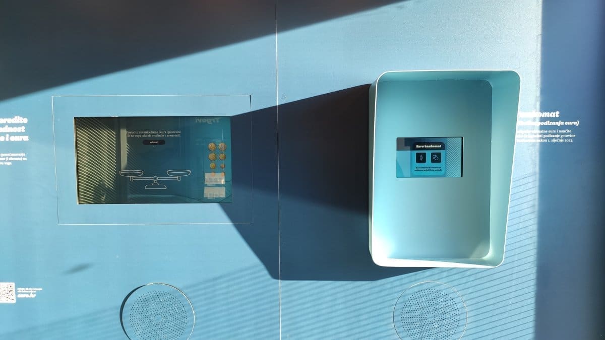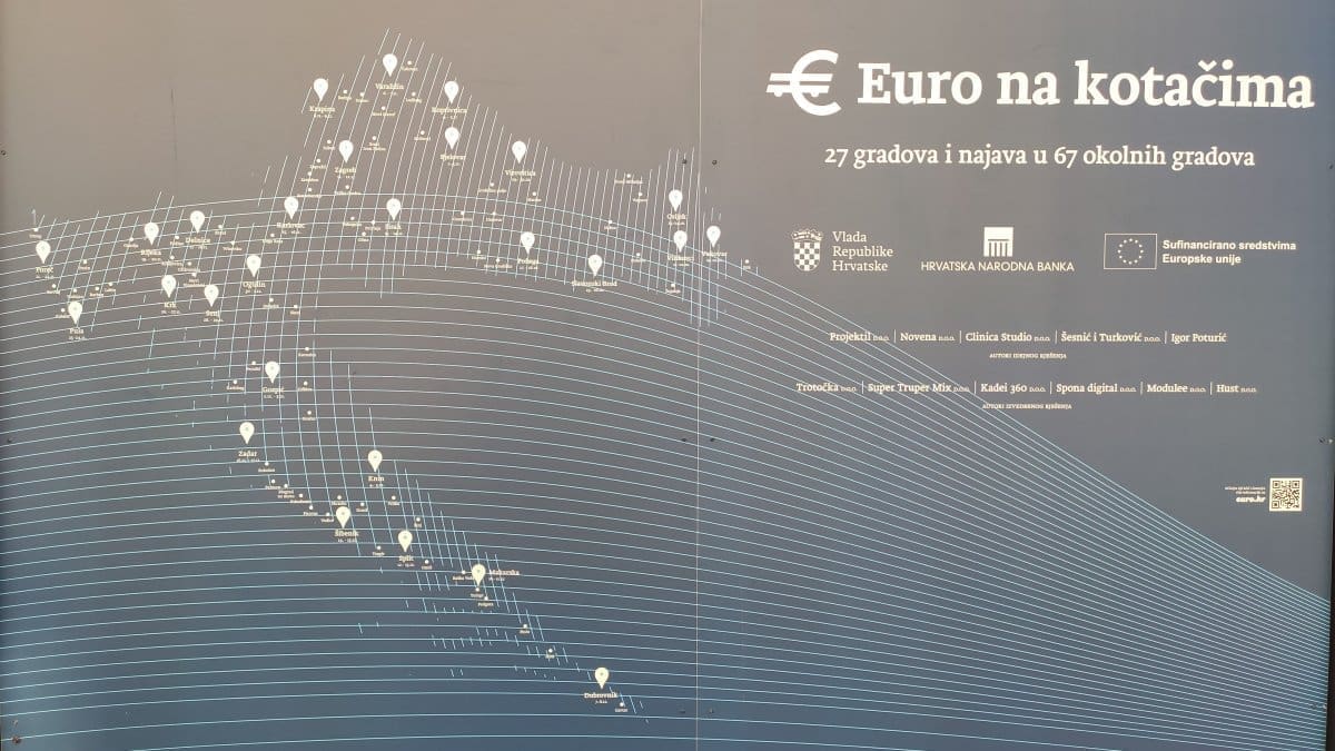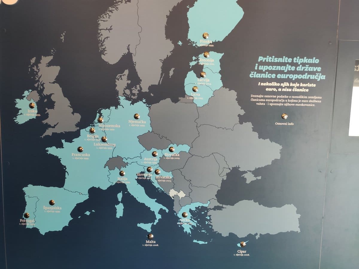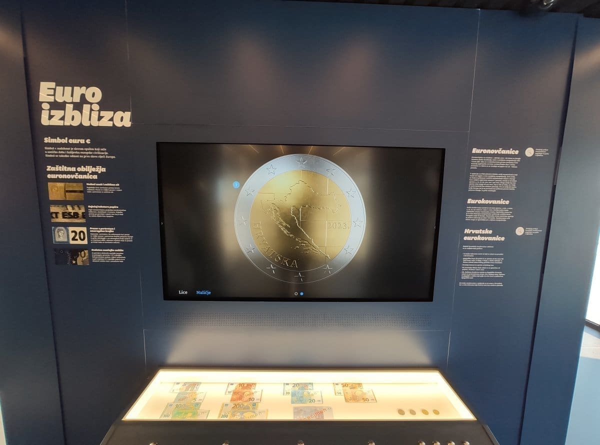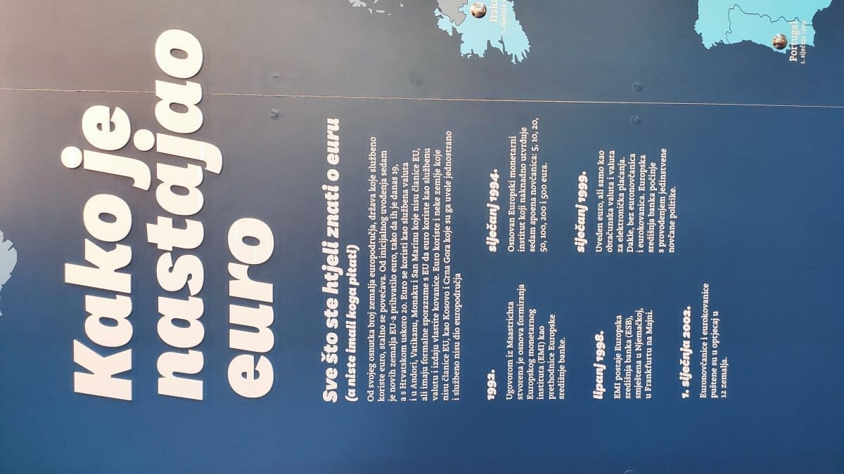 Dodaje da posjetitelji izložbe u jednom dijelu prolaze kroz neke ključne datume vezane uz EU i hrvatsko članstvo, te da se mogu vidjeti uvećane kovanice i novčanice eura.