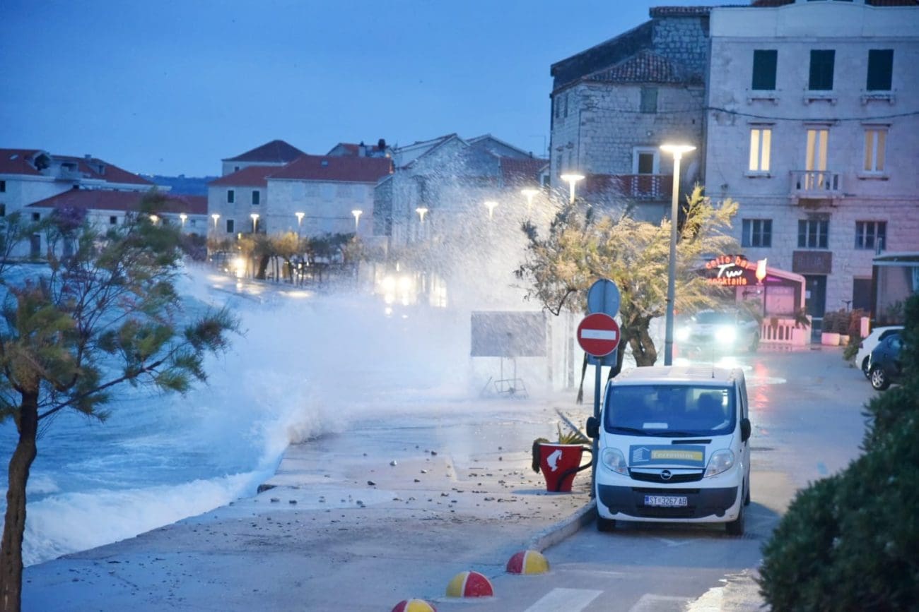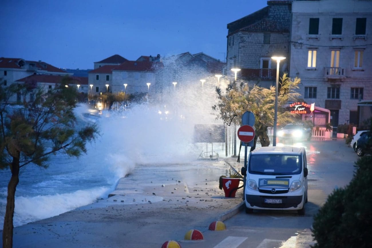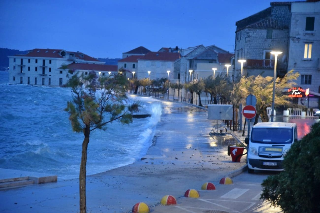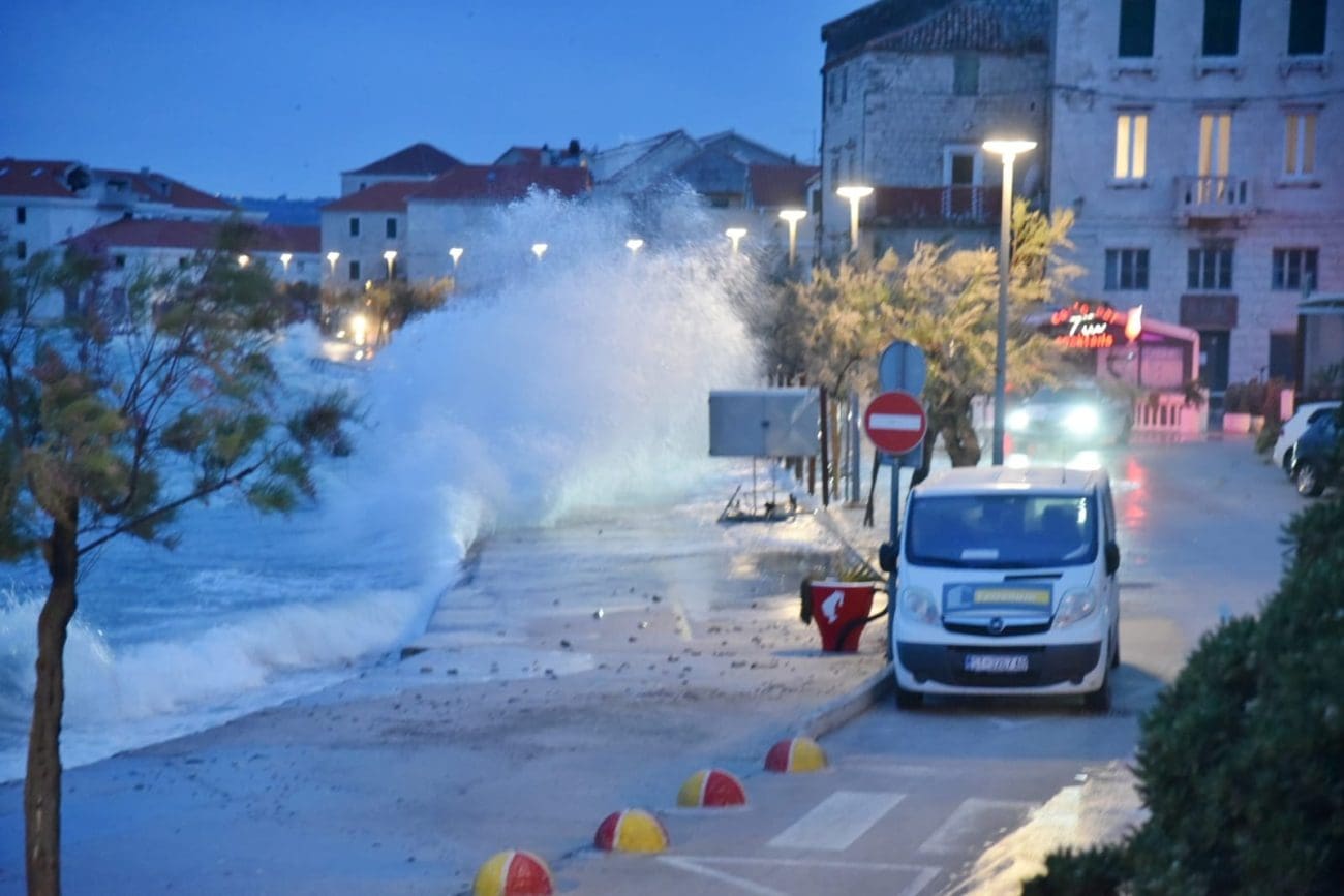 U današnjem obilasku donjokaštelanske rive zatekli smo udare valova visine i do 3-4 metra, a mještani nam pričaju kako očekuju besanu noć.
