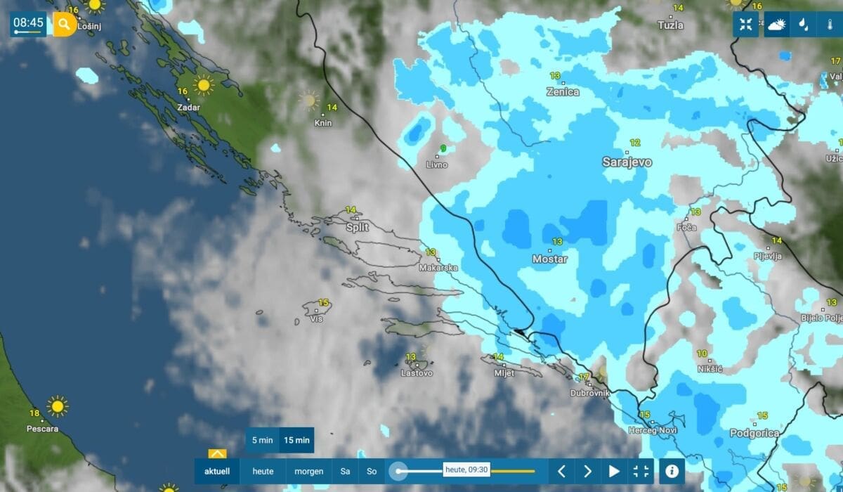 Nestabilne vremenske prilike nastavile su se u Dalmaciji tijekom četvrtka. Dok je na sjeveru Dalmacije bilo suho i sunčano, drugdje je bilo mjestimične kiše. Lokalno su pale i veće količine oborina.