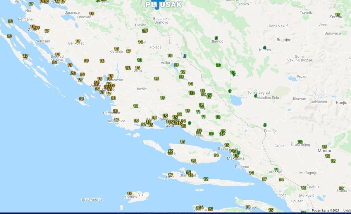 Prema podacima mreže postaja Pljusak.com, do 10 sati najviše kiše je palo u Živogošću, čak 40 litara kiše po kvadratnom metru. Slijede Korčula 30, Humac na Hvaru 25, Zaostrog 19, Makarska, Vrgorac i Zadvarje 18, Biokovo i Selca 17, Bol 14 itd.