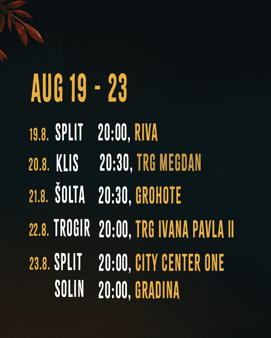 Koncerti, radionice za djecu i prigodna popratna događanja održavat će se od 19. do 23. kolovoza na šest lokacija: Split, Trogir, Klis, City Center One, Solin i Šolta, uz sudjelovanje više od 200 izvođača iz cijelog svijeta.