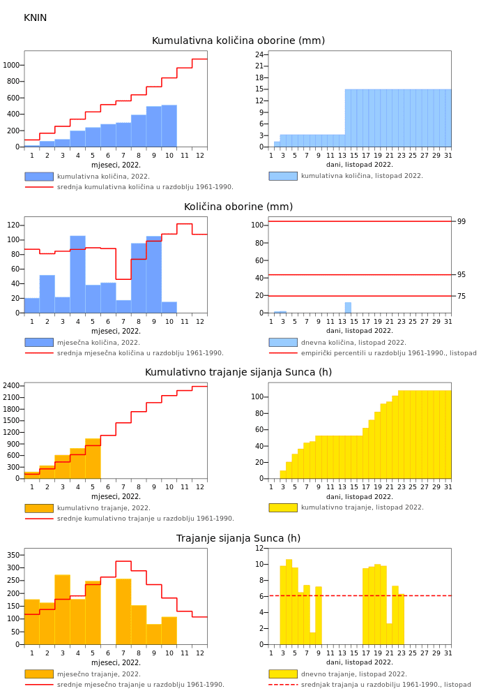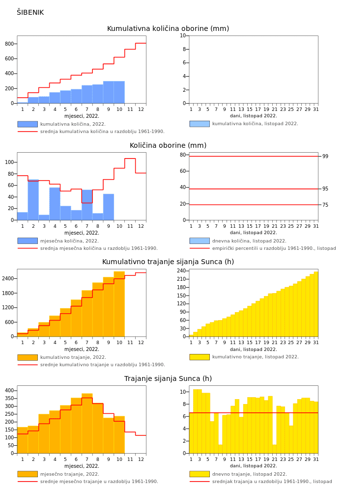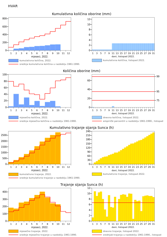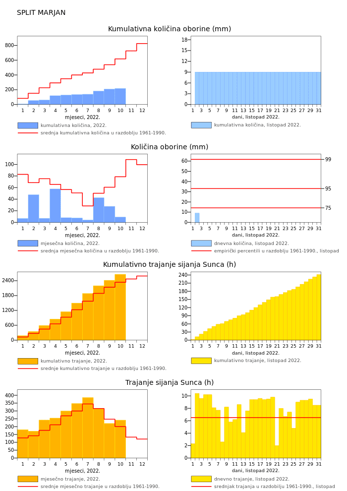 Prvih deset mjeseci 2022. godine u Splitu je, prema službenim podacima DHMZ-a, bilo najsušnije od početka službenih meteoroloških mjerenja. U Splitu su mjerenja počela prije nešto manje od 100 godina, no kontinuirani podaci postoje od 1946. Ukratko, za naših života nije se nikada dogodilo da prvih 10 mjeseci neke godine bude tako sušno kao do sada. Konkretno, postaja na Marjanu zabilježila je u spomenutom razdoblju 218 litara kiše po metru kvadratnom, što je tek nešto više od trećine oborine koja prosječno padne u prvih 10 mjeseci.