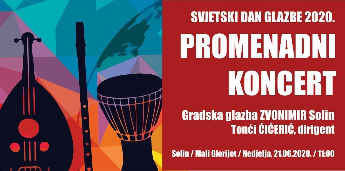 Povodom obilježavanja Svjetskog dana glazbe, Gradska glazba "Zvonimir" Solin u suradnji s Javnom ustanovom u kulturi Zvonimir Solin priređuje Promenadni koncert, u nedjelju, 21. lipnja 2020. na Malom Glorijetu u Solinu, s početkom u 11 sati.