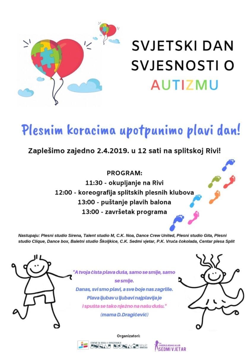 Na splitskoj Rivi tako će u 12 sati zaplesati splitske plesne skupine, okupljene oko pjesme himne ”Daj da se smire boje” (autorice D. Pleško), nakon čega će uslijediti simbolično puštanje plavih balona. Plava boja kao simbol autizma ujedno predstavlja njihove nedodirljive svjetove u kojem kriju svoje osjećaje i unutarnje radosti. Ovim putem Vas pozivamo da se odazovete „plesnoj štoriji“ i zaplešete za one kojima je potrebna naša nesebična podrška kako bi im kroz pokrete ljubavi otvorili prozor u vanjski svijet. Podarite i Vi Vaš plesni korak našim prijateljima iz spektra autizma i dođite 2.4.2019. na Rivu s početkom u 12 sati!