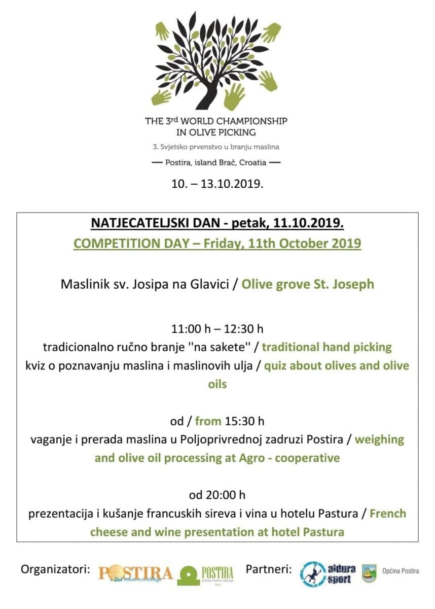 Apsolutni pobjednik prethodnog 2. Svjetskog prvenstva u branju maslina bila je reprezentacija Hrvatske sa ubranih 67 kg. I ove godine reprezentacijski timovi zemalja sudionica broje četiri člana (dva ženska člana i dva muška člana), a kategorije u kojima će odmjeravati snage su tradicionalno ručno branje „na sakete“ i moderno branje (tresačima i grabljicama). Osim natjecateljskog dijela, organizirati će se radionice, degustacije, izleti i zabavne večeri, kako bi se na najbolji način doživjela Postira, etno eko selo Dol, ali i sam otok Brač.