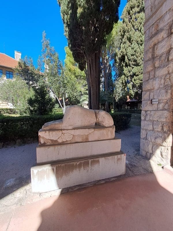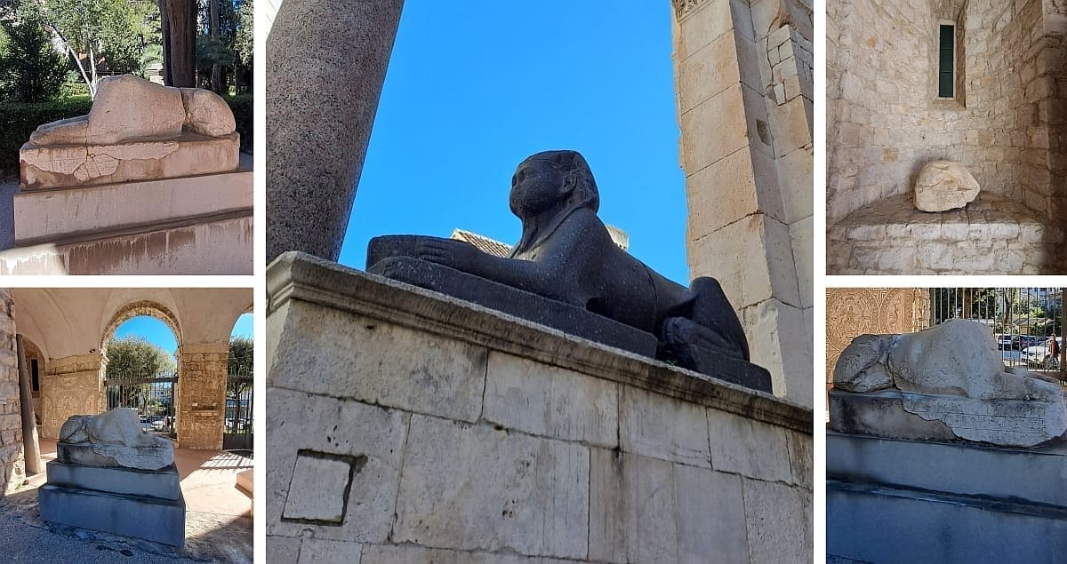 Kako Belamarić kaže za naš portal, dvije sfinge su nađene u trijemovima nekadašnjeg dekumana (na današnjoj Krešimirovoj ulici), a čak šest njih u podrumima (uključujući fragment sfinge na Bulićevoj poljani) – dakle izvan temenosa. Dvije su, konačno, pronađene pred sjevernim zidom – jedna neposredno uza nj, druga u današnjem Đardinu.