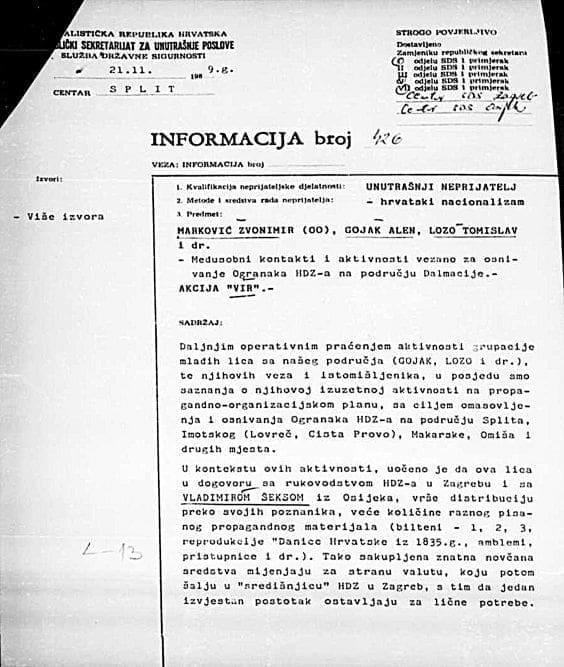 Raspolažemo provjerenim podacima da je Korljana i Markovića kontaktirao GOJAK ALEN iz Splita, koji je od JURIĆ PERICE iz Zagreba dobio zadatak da animira lica za osnivanje „Tuđmanovog ogranka“ Odbora HDZ-a na području Dalmacije. U tom kontekstu također je kao osoba zadužena za ovo područje angažiran i ŠITUM FILIP iz Splita“.
