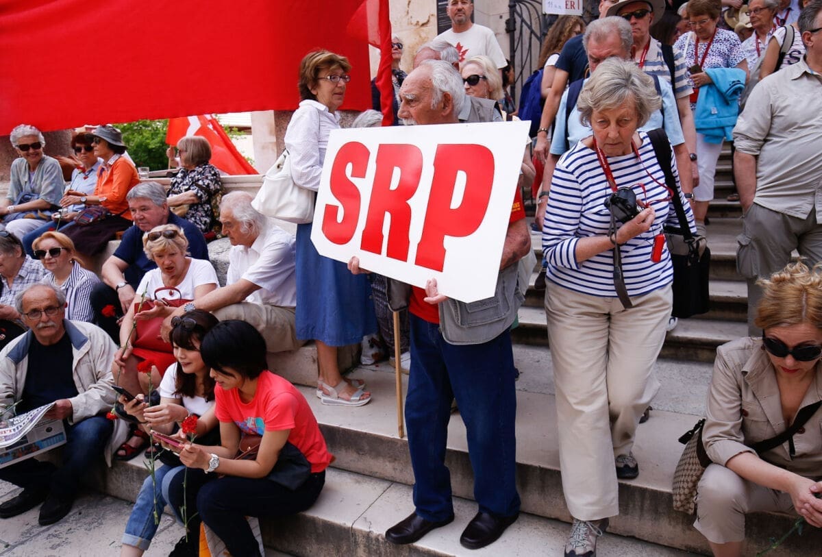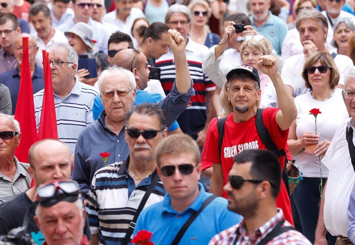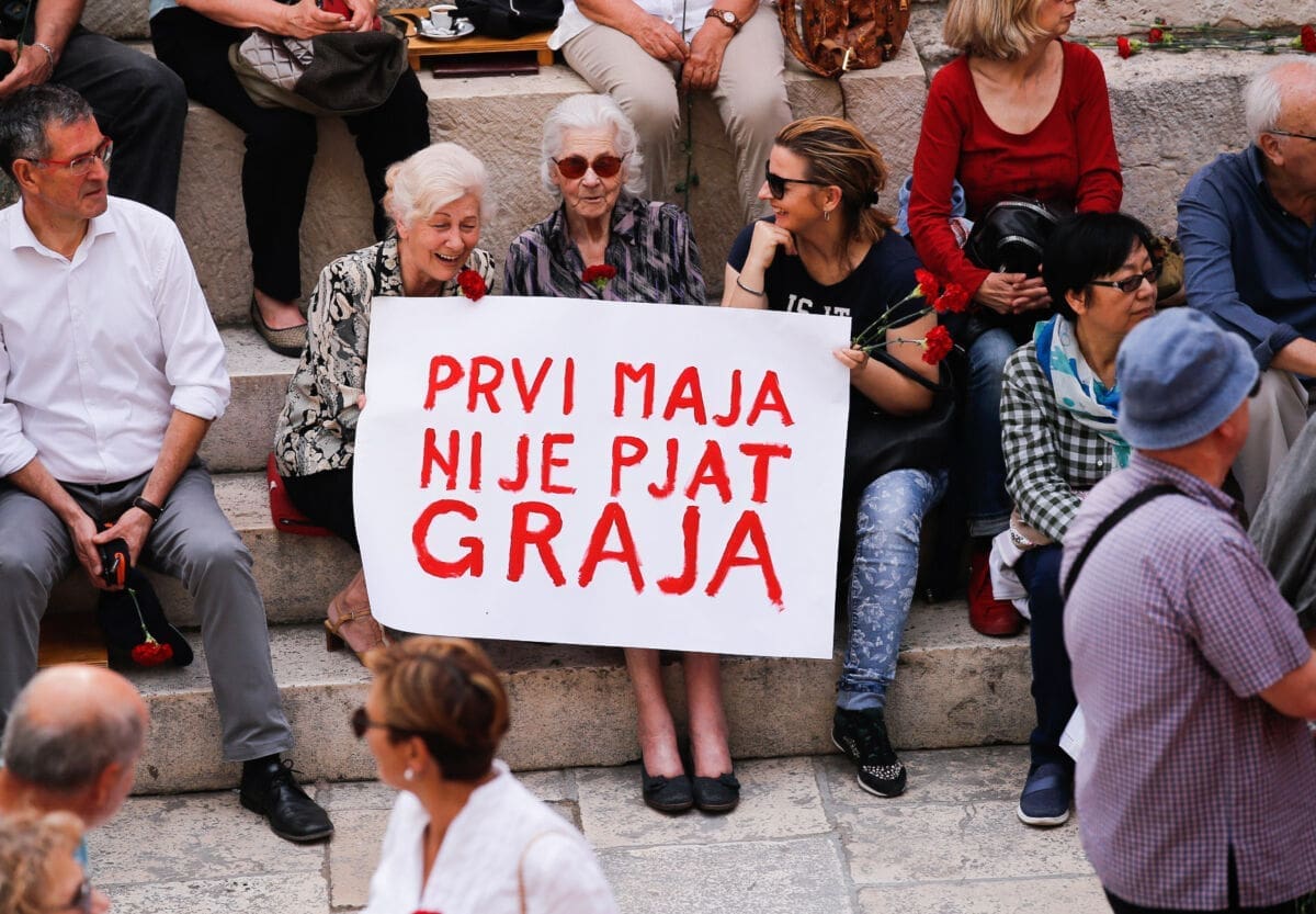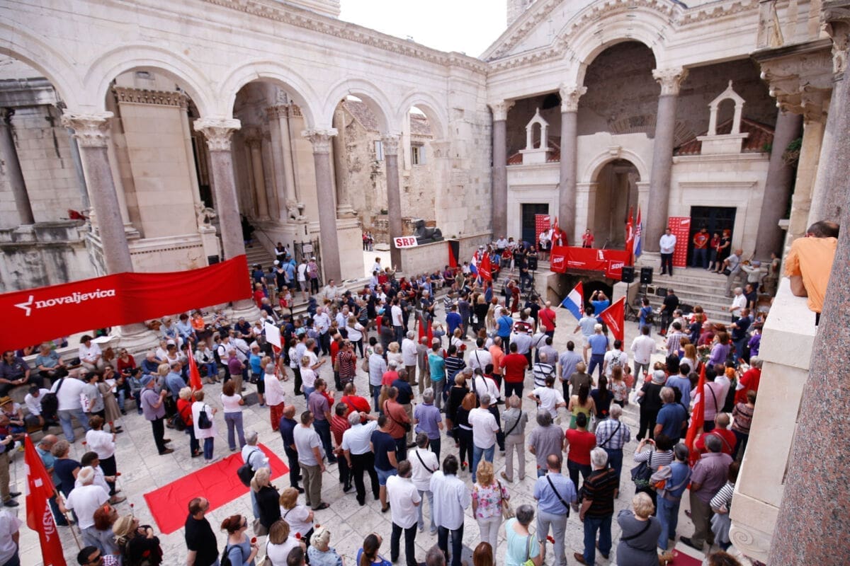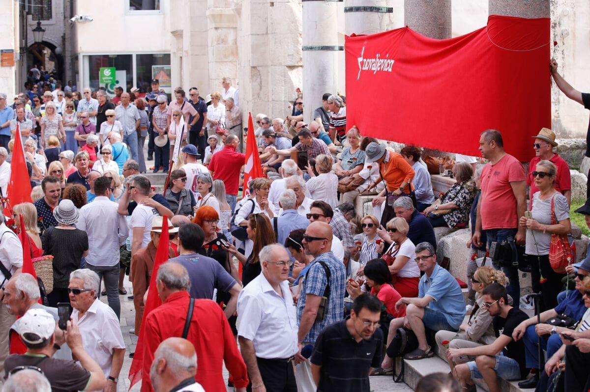 Uz intorniranje Lijepe naše i Internacionale u 10 sati je na Peristilu počeo Prvomajski skup u organizaciji splitskog SDP-a i Nove ljevice.