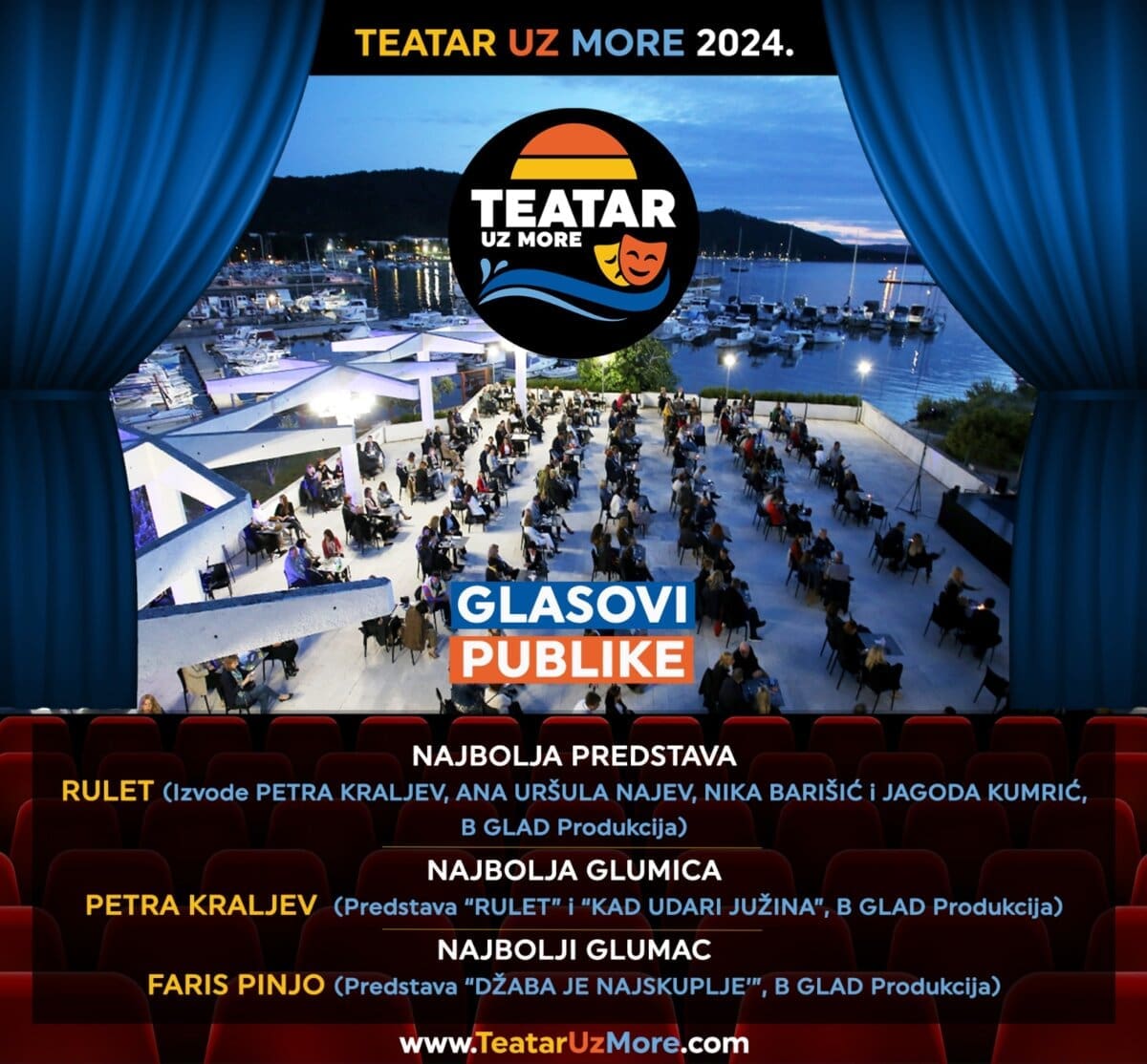 Nagradu za najbolju kazališnu predstavu publika je dodijelila komediji "Rulet" u izvedbi izvrsne ženske četvorke Petre Kraljev, Jagode Kumrić, Nike Barišić i Ane Uršule Najev.