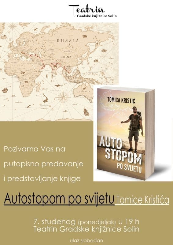 Putopisno predavanje i predstavljanje knjige "Autostopom po svijetu" Tomice Kristića održat će se u Teatrinu GK Solin u ponedjeljak, 7. studenog u 19 sati.