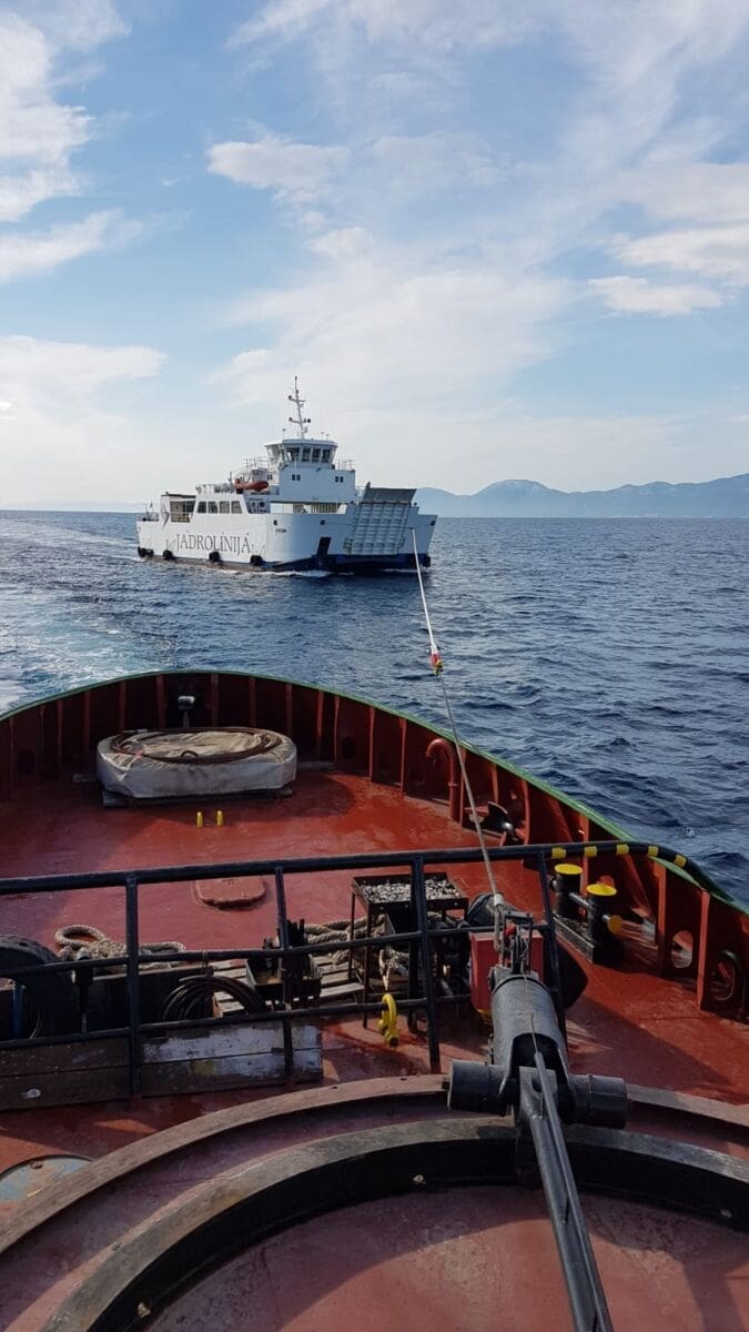 Od jutros se iz Sućurja na Hvaru prema brodogradilištu u Trogiru tegli trajekt Ston kojemu su prije četiri dana otkazali motori te je udario o obalu, a potom se i nasukao.