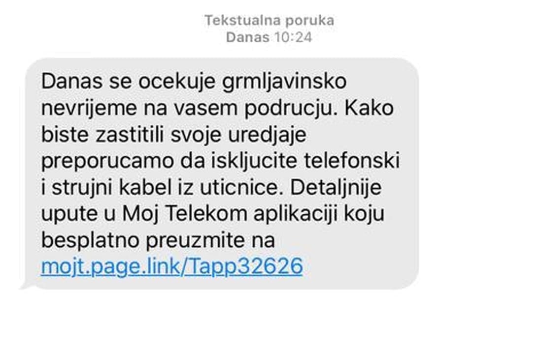 "Danas se očekuje grmljavinsko nevrijeme na vašem području. Kako biste zaštitili svoje uređaje, preporučujemo da isključite telefonski i strujni kabel iz utičnice - stoji u upozorenje danas poslano korisnicima u Dalmaciji.