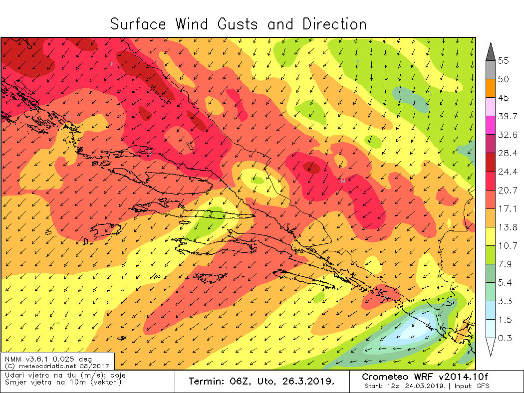 U noći na utorak jače naoblačenje s kišom, ponegdje i pljuskovima s grmljavinom. Kiša će u planinama prijeći u snijeg. Ponegdje je do jutra susnježica moguća i u nekim dijelovima Zagore. Snježna granica na obalnom gorju oko 800 metara nadmorske visine. U drugom dijelu dana postupan prestanak oborina, prvo će zahvatiti sjevernu Dalmaciju. Puhat će jaka do olujna bura. Podno Velebita, Dinare i Biokova bit će i orkanskih udara. Bit će osjetno hladnije s najvišim dnevnim temperaturama od 6 do 16°C.