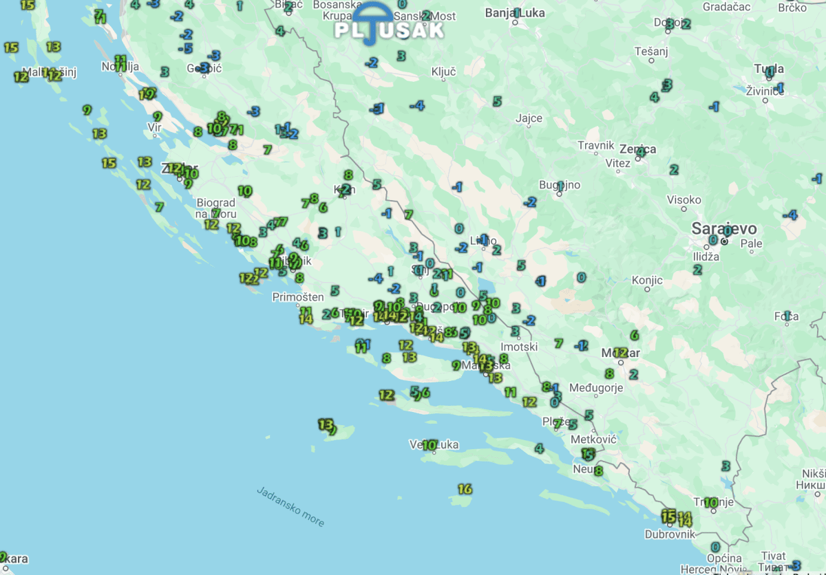 Još impresivnije podatke moguće je vidjeti na mreži postaja Pljusak.com. Gorski kotar je bio najhladnije dio zemlje, tako je u Vranovini izmjereno - 5,3°C, na Bjelolasici -4,9°C. -4°C je bilo u Jelvici, Zrnićima, Tuku, Mrkoplju i Ravnoj Gori. I Dalmacija svoga “konja” za utrku ima. Tako je jutros čak -4°C izmjereno u Niskome koji se inače nalazi na terotiroiju općine Klis. Prugovo je mjerilo -2°C, a uz { je izmjereno u Nečujmu na otoku Šolti. Donja Tijarica je mjerila -0,1°C, a tek koju desetinku stupnja iznad nule zabilježili su Han, Vrbanj Polje u Zadvarju, Dolića Draga, Gruda, Grohote Šolta i Staševica. Jutro je najtoplije bilo u Lastovu s ugodnih 16°C.
